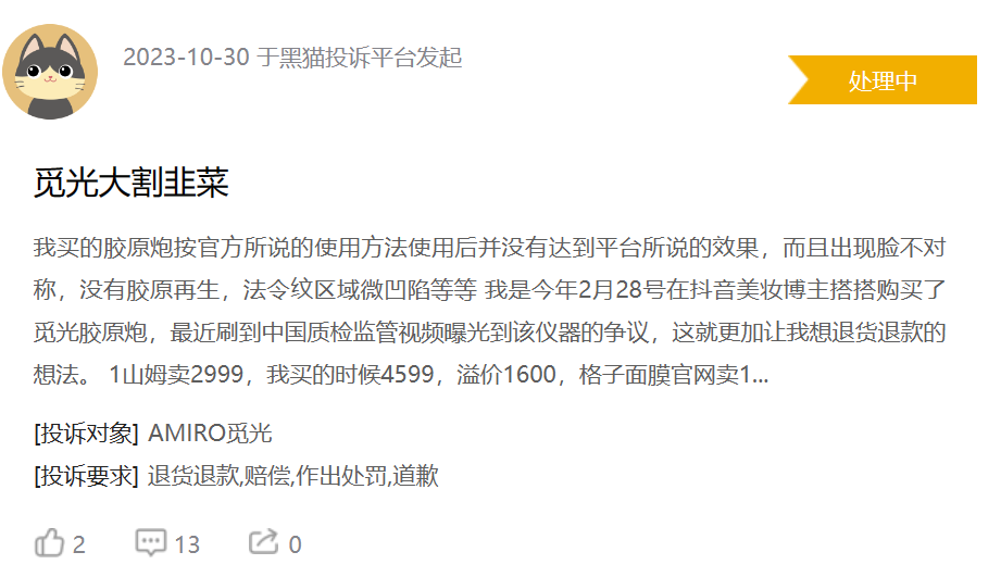 這些事件也進一步引發(fā)了消費者對于AMIRO覓光利用產(chǎn)品升級的信息差來定價的質疑。據(jù)黑貓投訴顯示,有消費者投訴AMIRO覓光“山姆賣2999,我買的時候4599,溢價1600”“覓光割韭菜,一代買完下個月就出二代,要求換新客服不處理”。