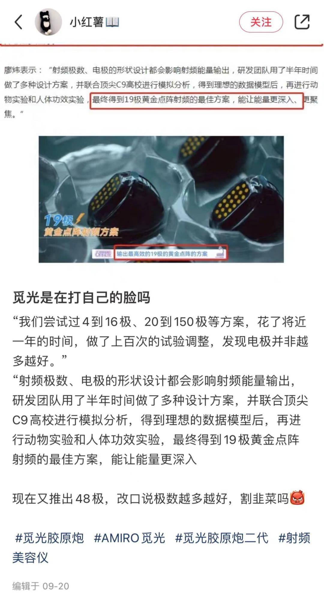 而到2023年6月,宗匠科技研發(fā)負責人曾在品牌文章中表示,經(jīng)過上百次實驗調整,發(fā)現(xiàn)電極并非越多越好,最終得到19極黃金點陣射頻的最佳方案,宣稱能讓能量更深入,更聚焦。然而,僅時隔三個月,AMIRO覓光2023年在9月的發(fā)布會上推出膠原炮二代,宣稱以48極黃金點陣射頻打造面中“能量巔峰”,從而精準解決抗老問題。