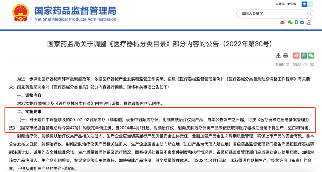 但伴隨著國家藥品監(jiān)督管理局發(fā)布《關于調整<醫(yī)療器械分類目錄>部分內容的公告(2022年第30號)》,自2024年4月1日起,射頻治療儀、射頻皮膚治療儀類產(chǎn)品未依法取得醫(yī)療器械注冊證不得生產(chǎn)、進口和銷售。