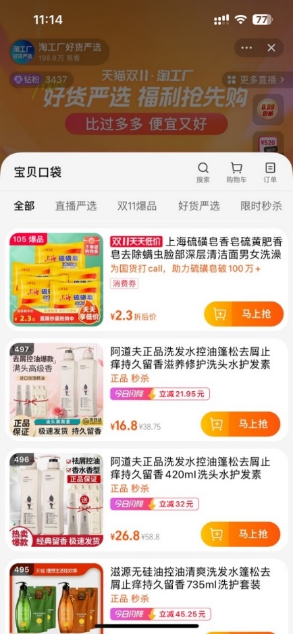 11月7日晚,淘工廠迅速反應(yīng),在官方直播間回應(yīng)稱,目前他們已經(jīng)整合了直播間、達(dá)人直播以及淘工廠會(huì)場(chǎng)資源,在雙11主會(huì)場(chǎng)內(nèi)專門搭建了“花樣國(guó)貨,折上再折”的國(guó)貨樓層,“上海硫磺皂”就排在醒目的樓層首位。