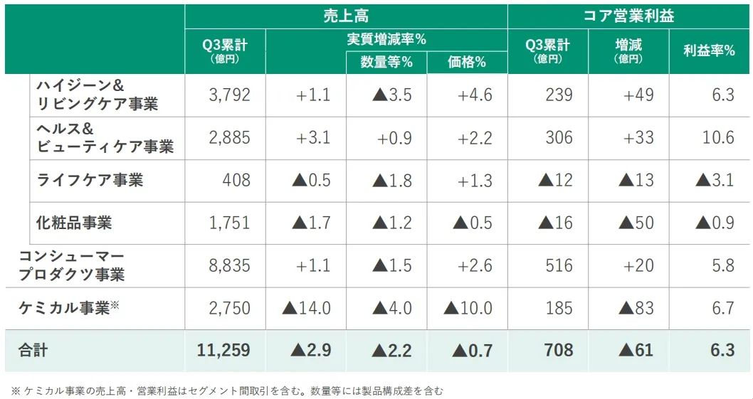 11月8日,花王發(fā)布前三季度財報。前三季度銷售額為11259億日元(約合人民幣543.64億元),同比下降0.2%,受匯率影響實際同比下降2.9%,減少凈值322億日元(約合人民幣15.5億元)。稅前核心營業(yè)利潤為708億日元(約合人民幣34.16億元),同比下降8.0%。