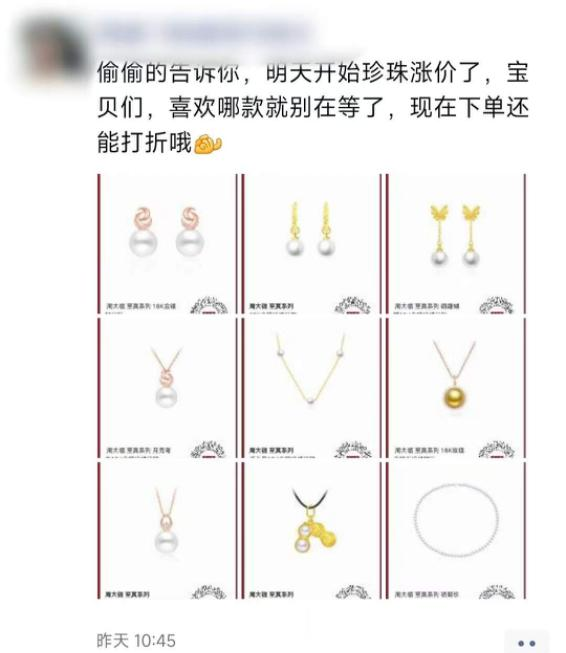 慶仔最近也發(fā)現(xiàn),周大福、周六福、菜百等主賣(mài)黃金的珠寶品牌,也開(kāi)始“大力”推銷(xiāo)珍珠飾品,“我當(dāng)初為了買(mǎi)金飾,為了盡早知道優(yōu)惠機(jī)制,加了好多品牌門(mén)店銷(xiāo)售微信,發(fā)現(xiàn)他們最近朋友圈推廣的內(nèi)容,珍珠的占比也多了起來(lái),之前我都不知道這些品牌還賣(mài)珍珠的!