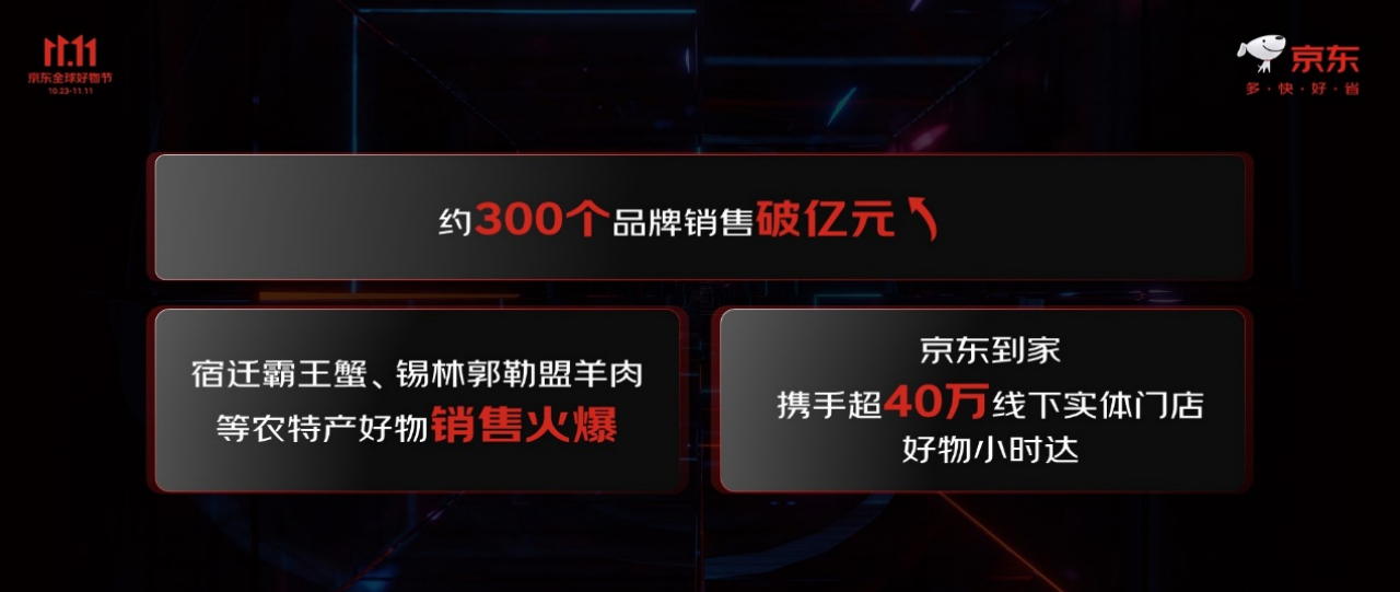 京東11.11火熱的氛圍同樣延續(xù)到了線下,京東旗下七鮮超市以及京東華冠超市也分分推出了擊穿底價活動,特別是民生商品如豬肉、牛肉和部分蔬菜更是同類商品“最低價”,帶動線下整體消費熱情提升。京東到家也攜手超40萬家線下實體門店,不僅為消費者提供了小時達、最快分鐘達的送貨上門服務(wù),更帶動山姆、麥德龍、美的、洋河等線下實體合作伙實現(xiàn)了爆發(fā)式增長,并助力超10萬新店成交額環(huán)比上月同期增長近8成。