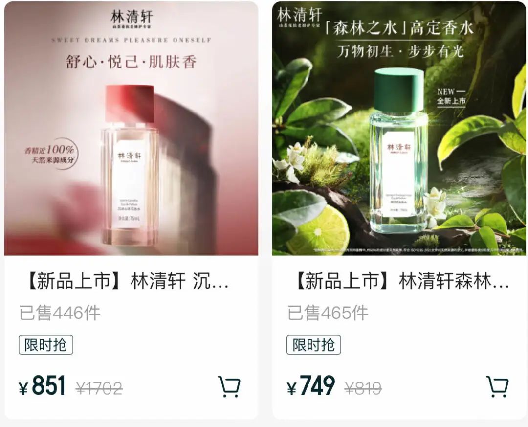 打造氛圍感。香水的包裝是山茶花的紅色系,名字又主打這個成分,佐以宣傳視頻里紅唇美女和柔和燈光,仿佛一朵盛開的山茶花。再加上鋪天蓋地的罵名,如今林清軒把價(jià)格砍半限時(shí)5折出售,這款香水在小程序已經(jīng)賣了400多件。