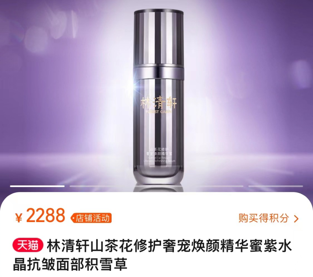為了把山茶花賣出輝煌,林清軒創(chuàng)始人曾經(jīng)炮轟香奈兒抄襲自家icon,在直播間豪飲山茶花精萃水。后來,傍上山茶花的林清軒終于把精油賣成高奢單品,單毫升價(jià)格遠(yuǎn)超茅臺。