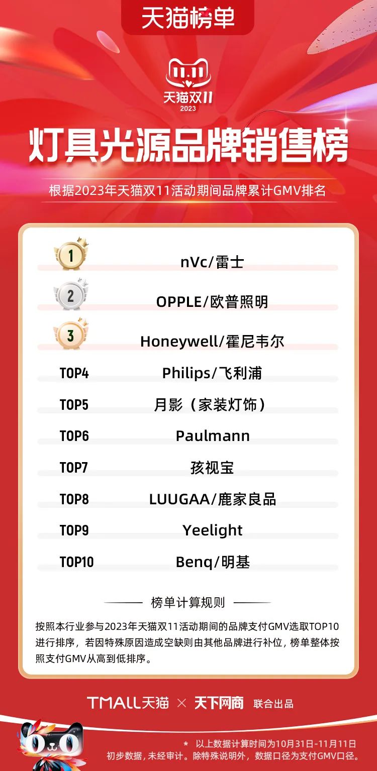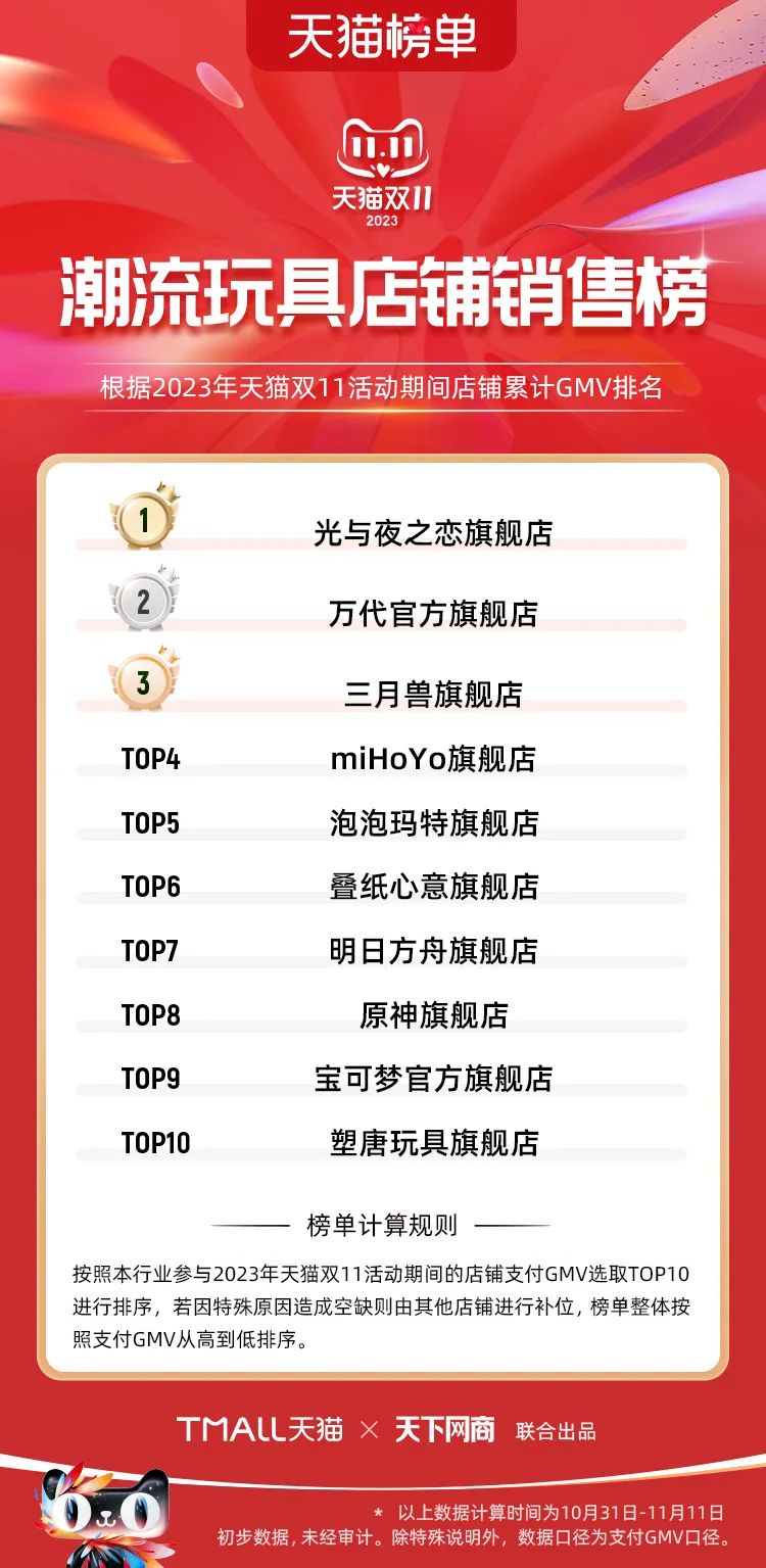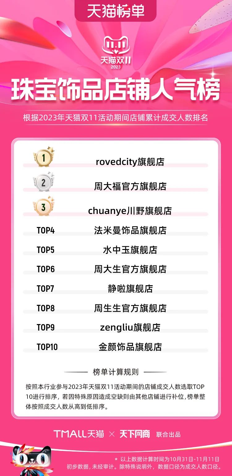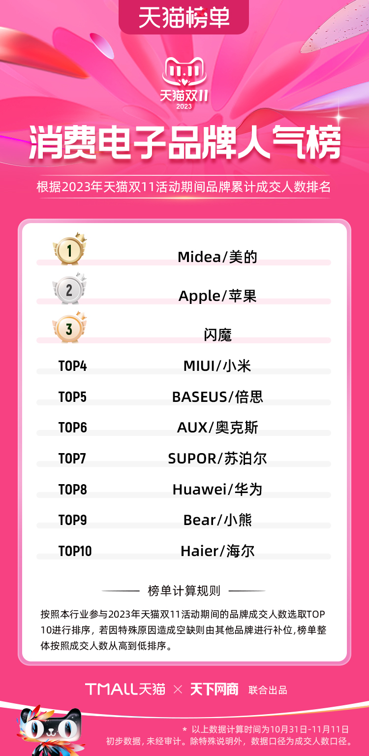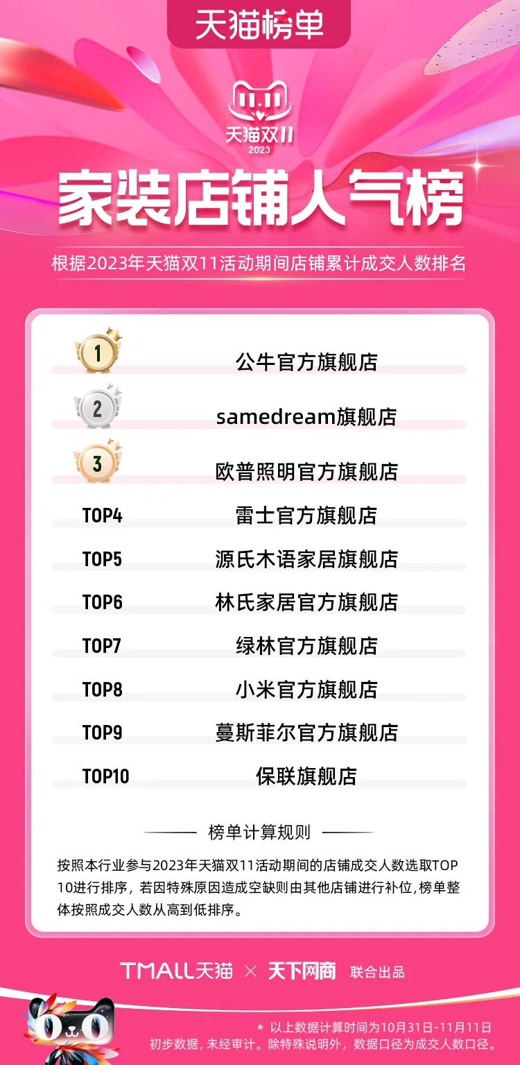 以下為2023年天貓雙11全周期(10月31日-11月11日)榜單: