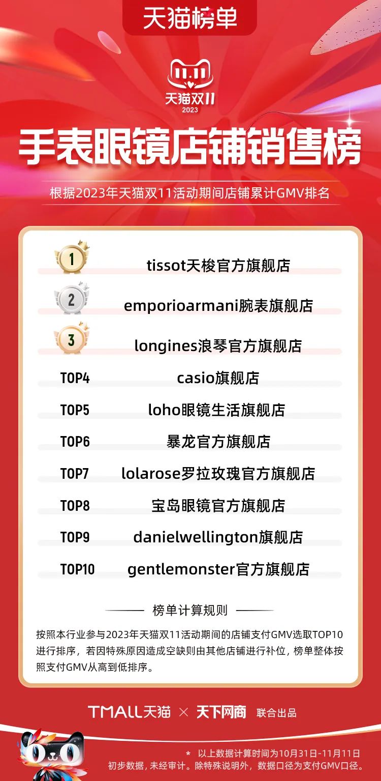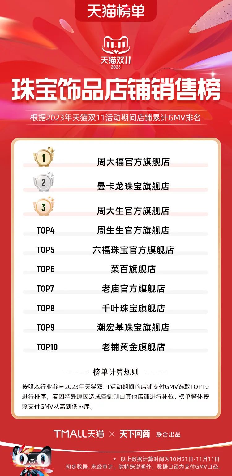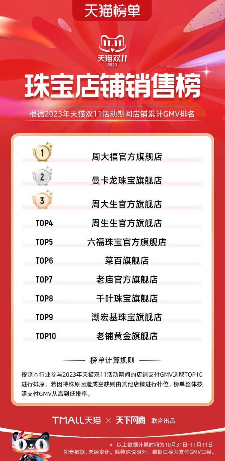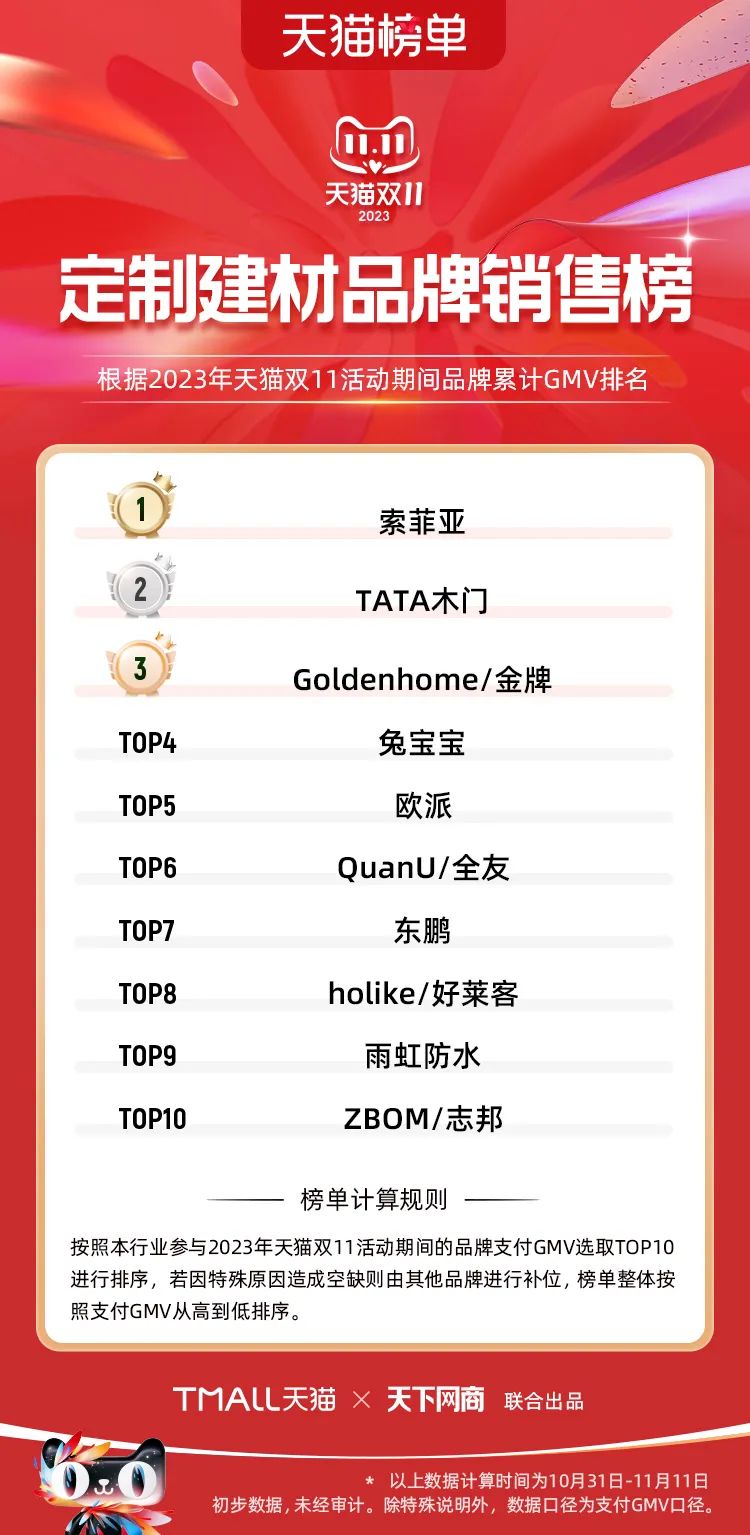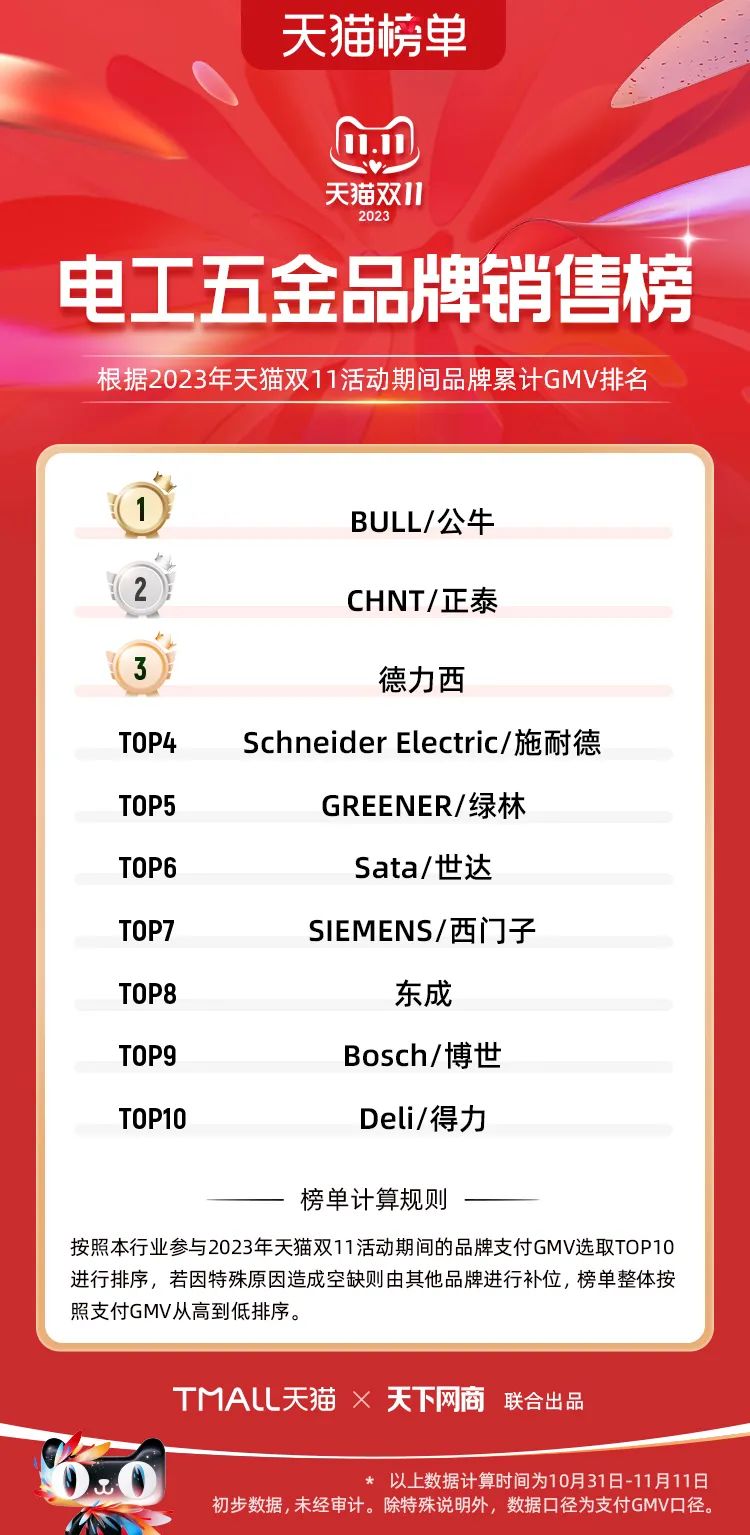 以下為2023年天貓雙11全周期(10月31日-11月11日)榜單:
