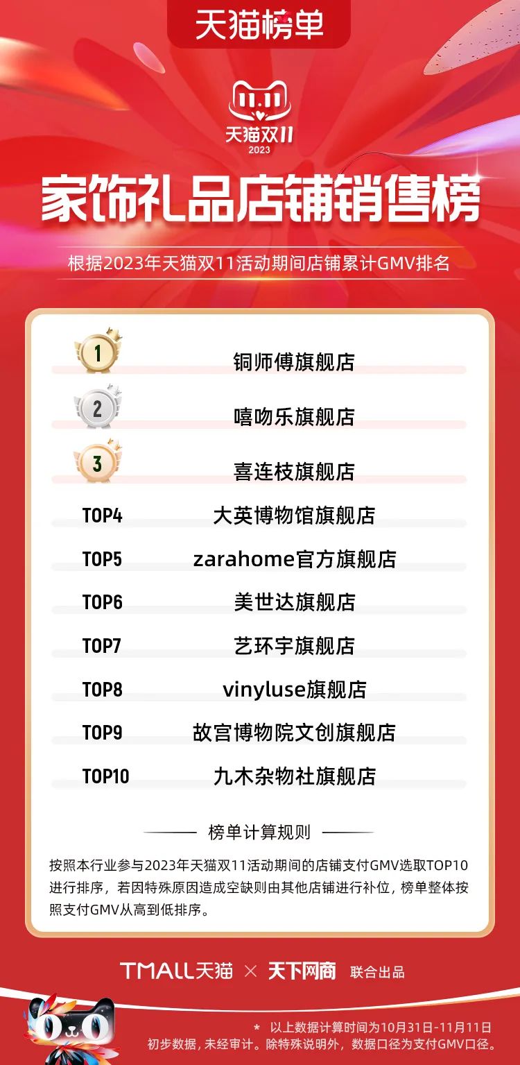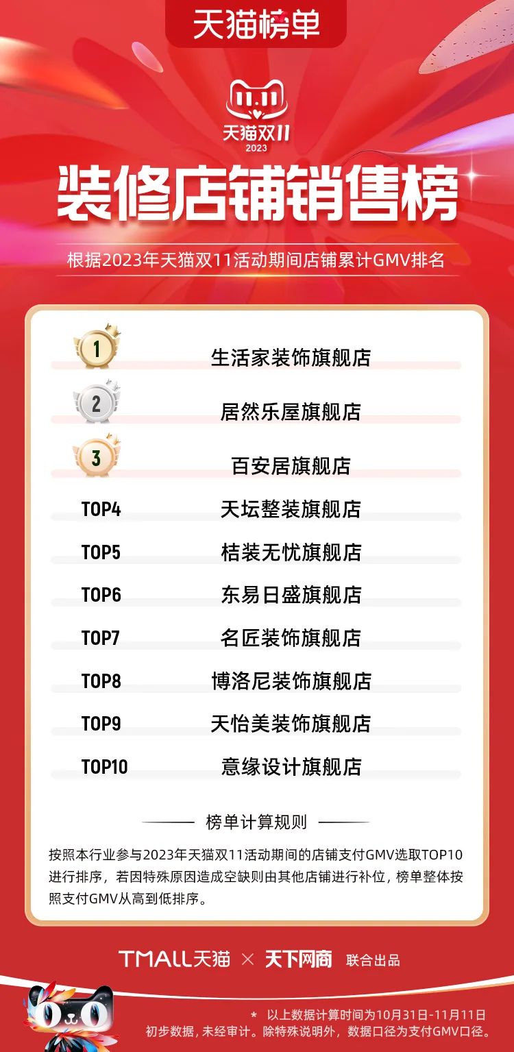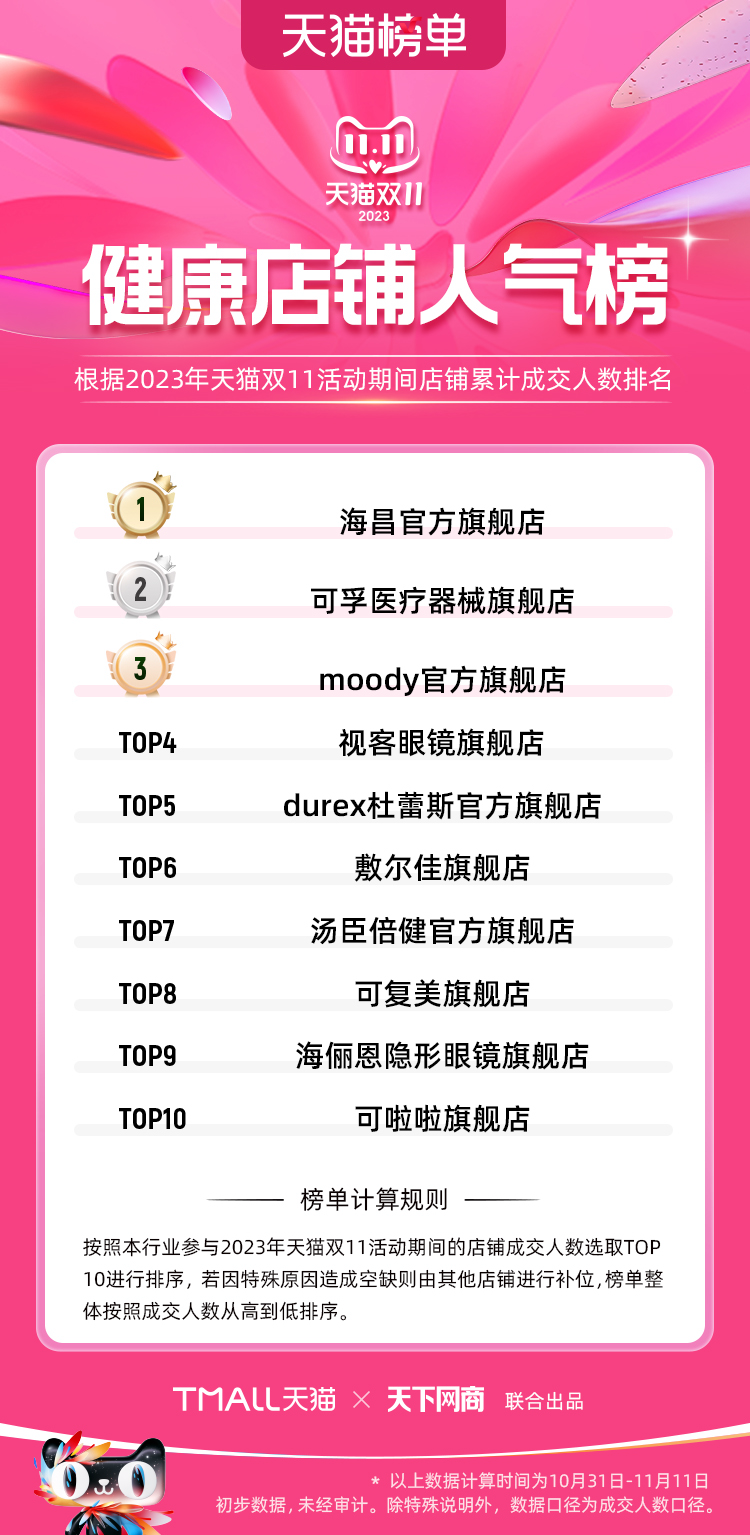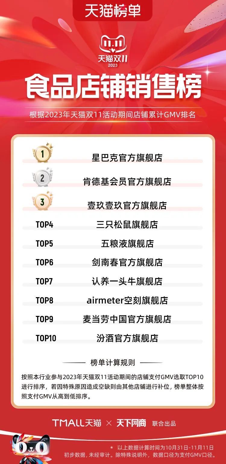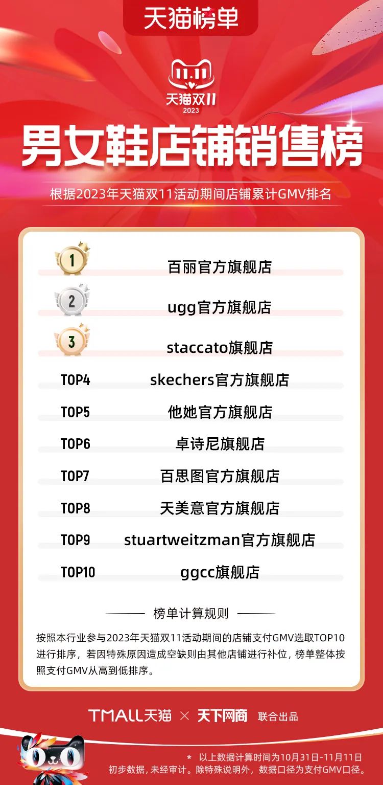 以下為2023年天貓雙11全周期(10月31日-11月11日)榜單: