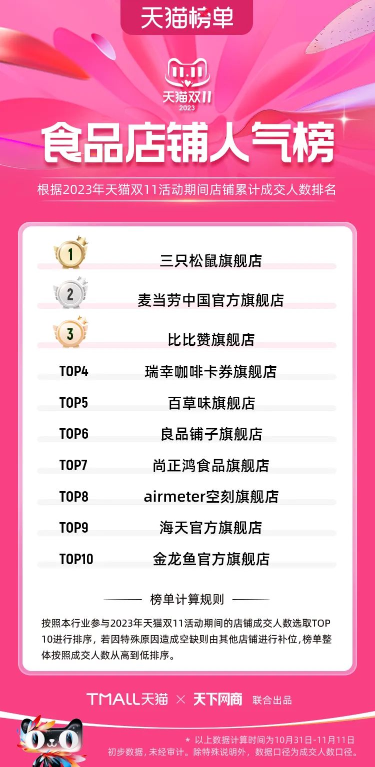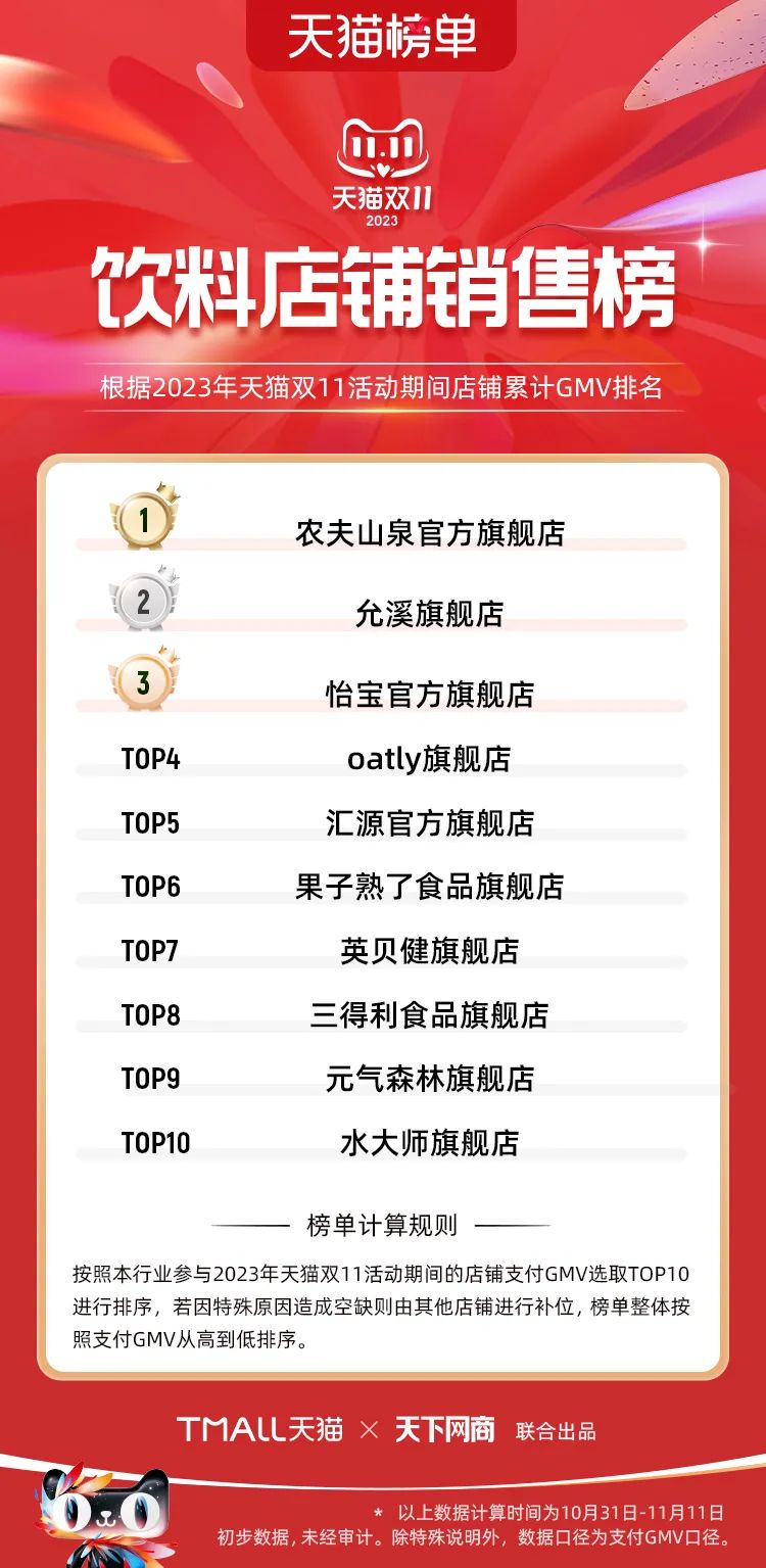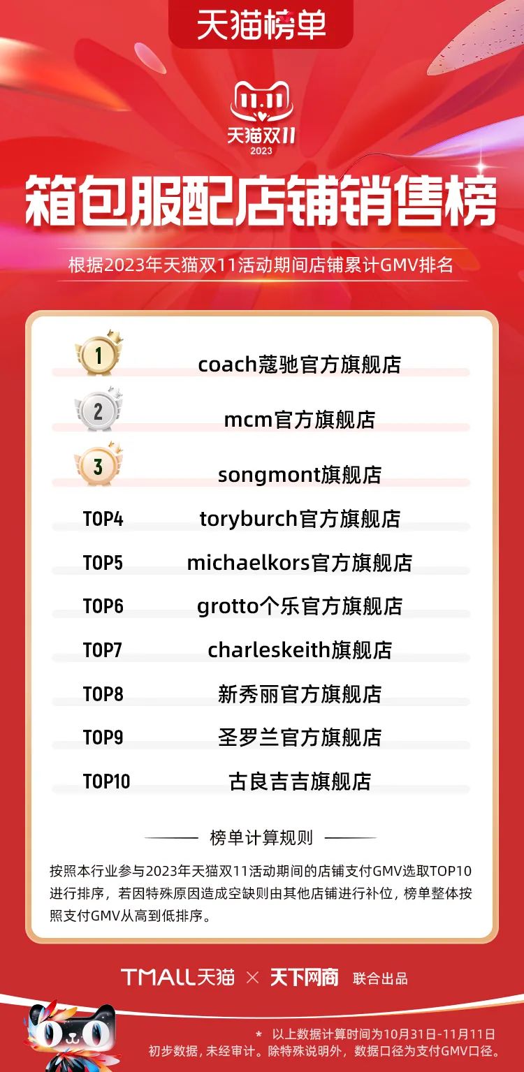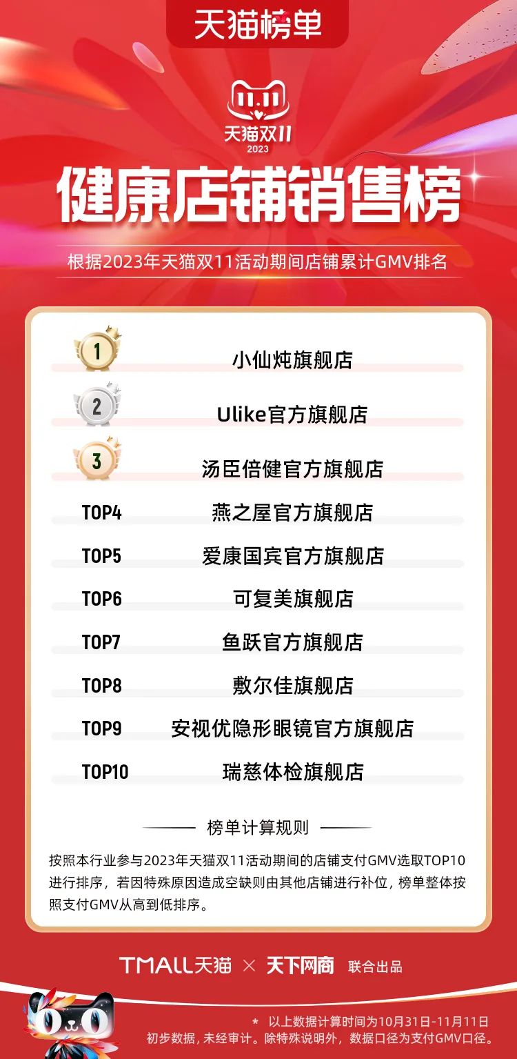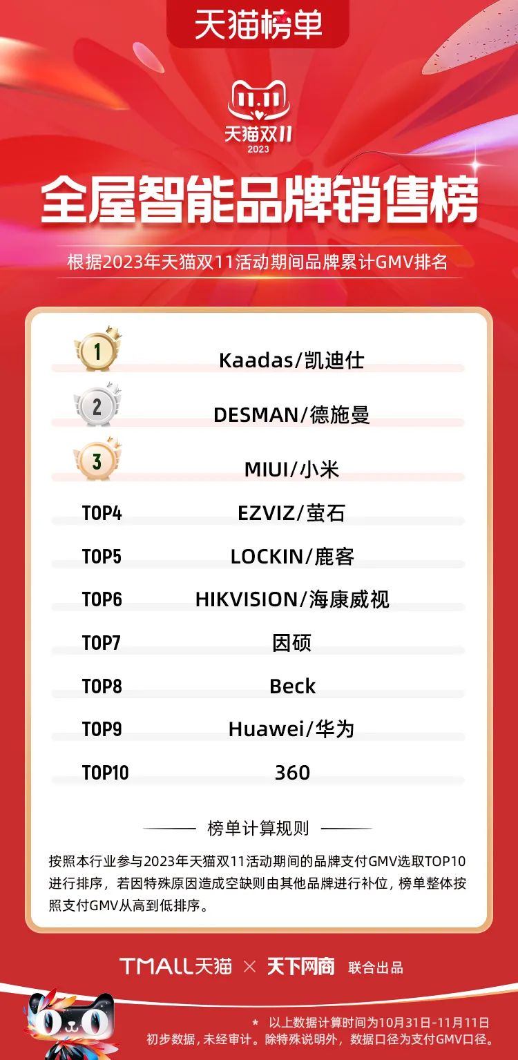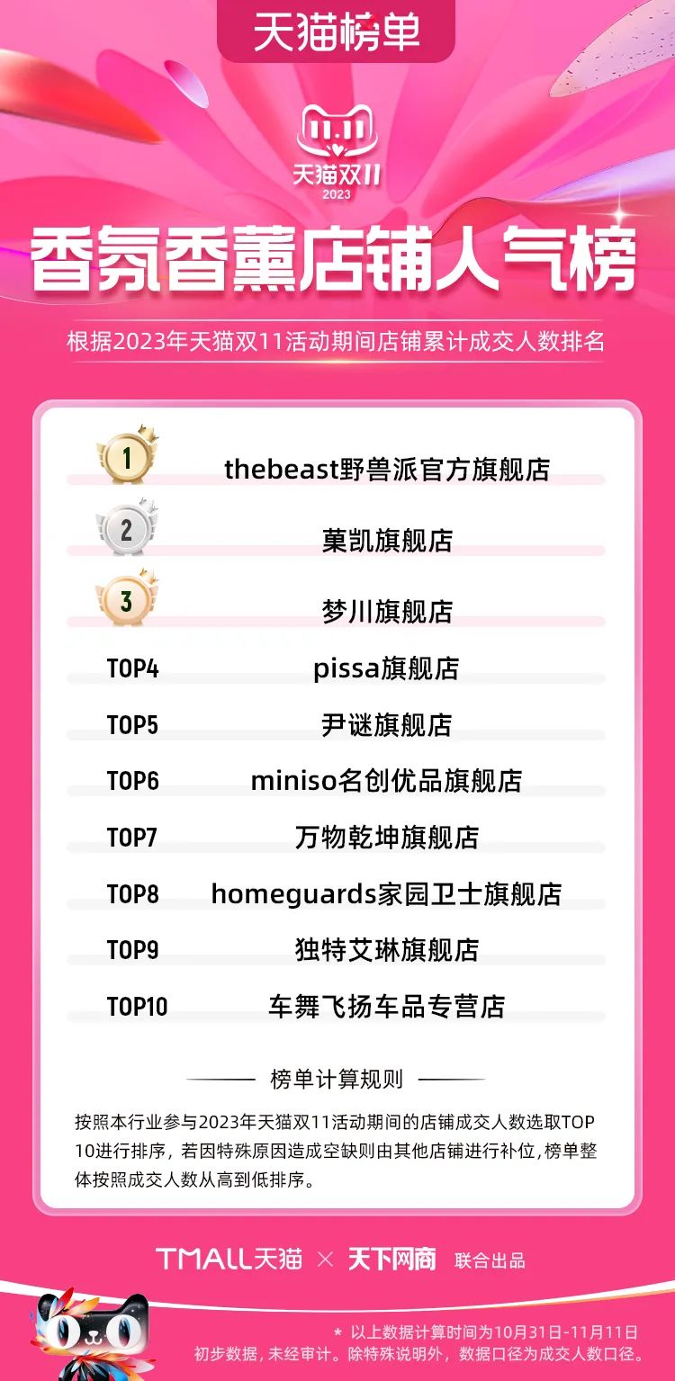 以下為2023年天貓雙11全周期(10月31日-11月11日)榜單: