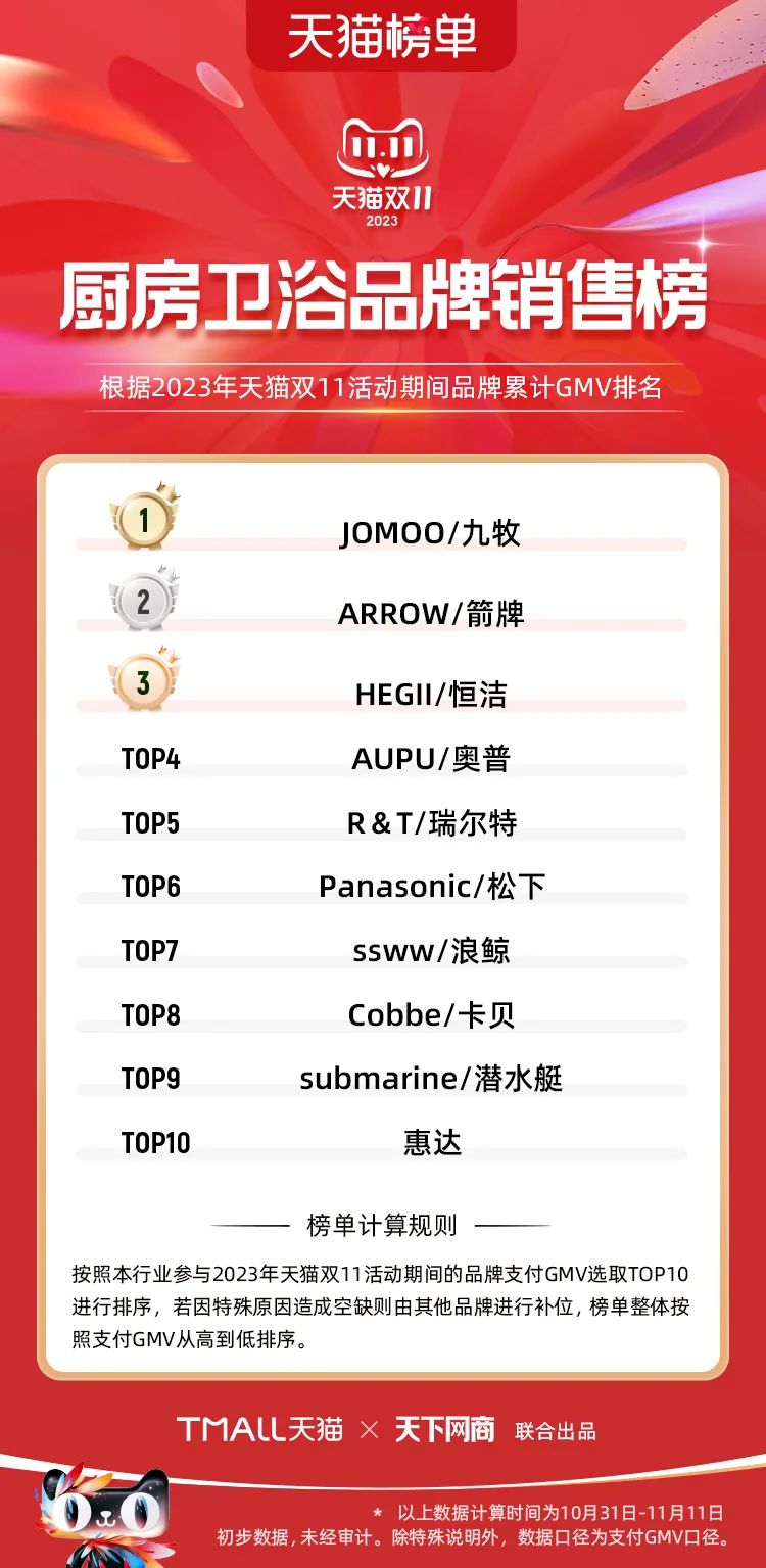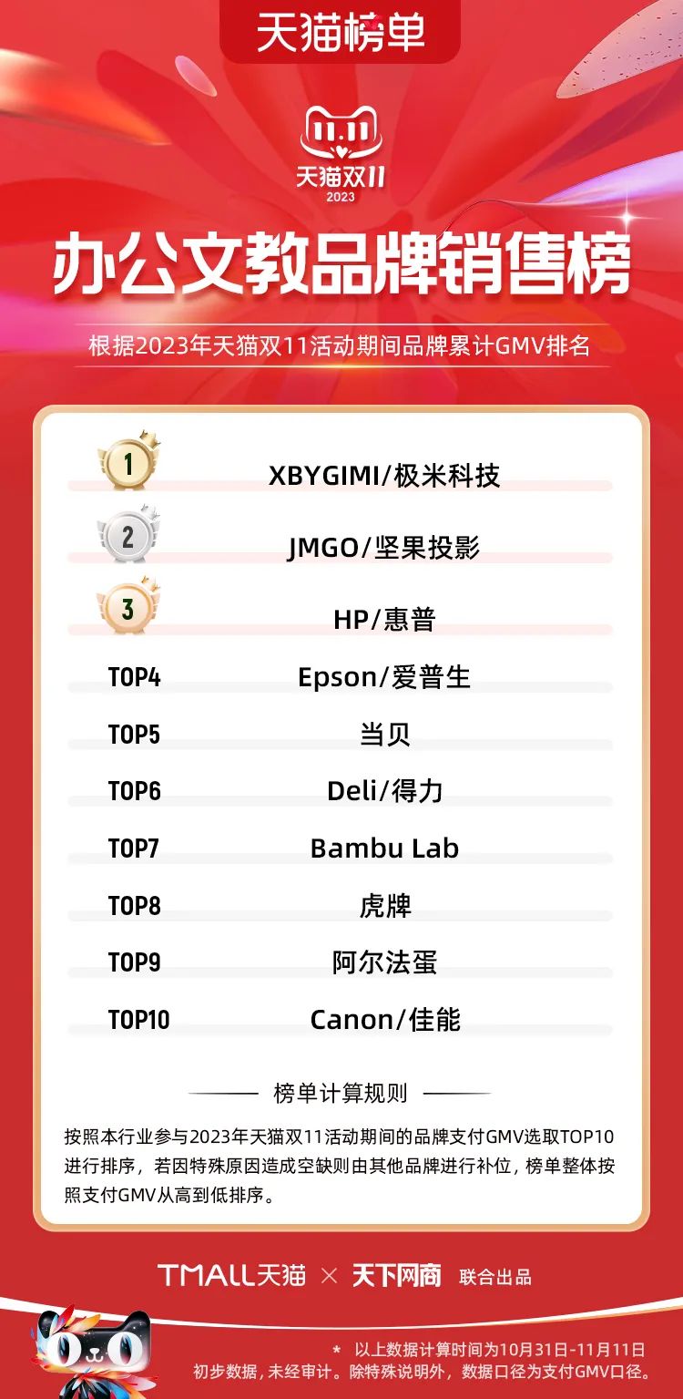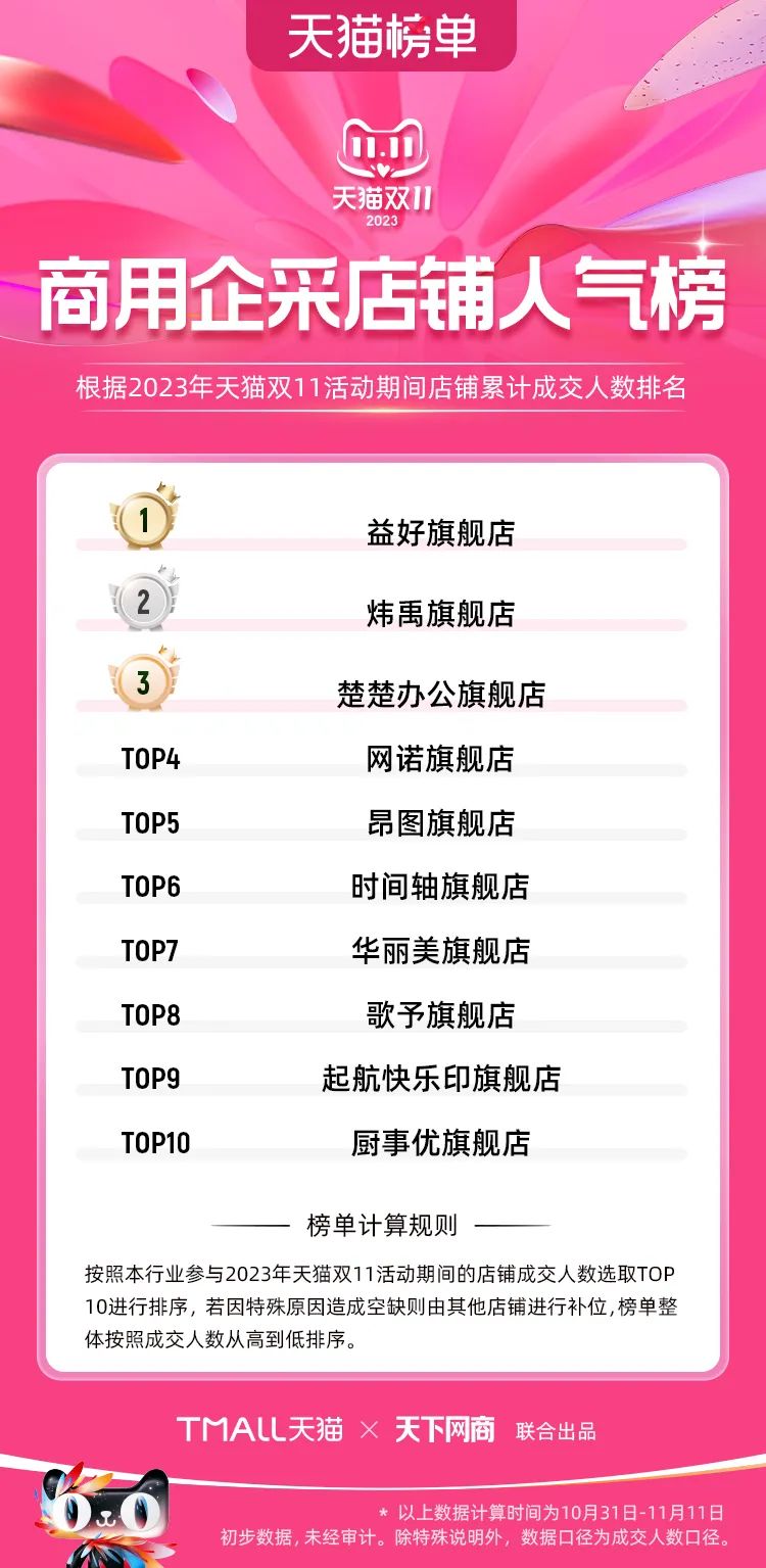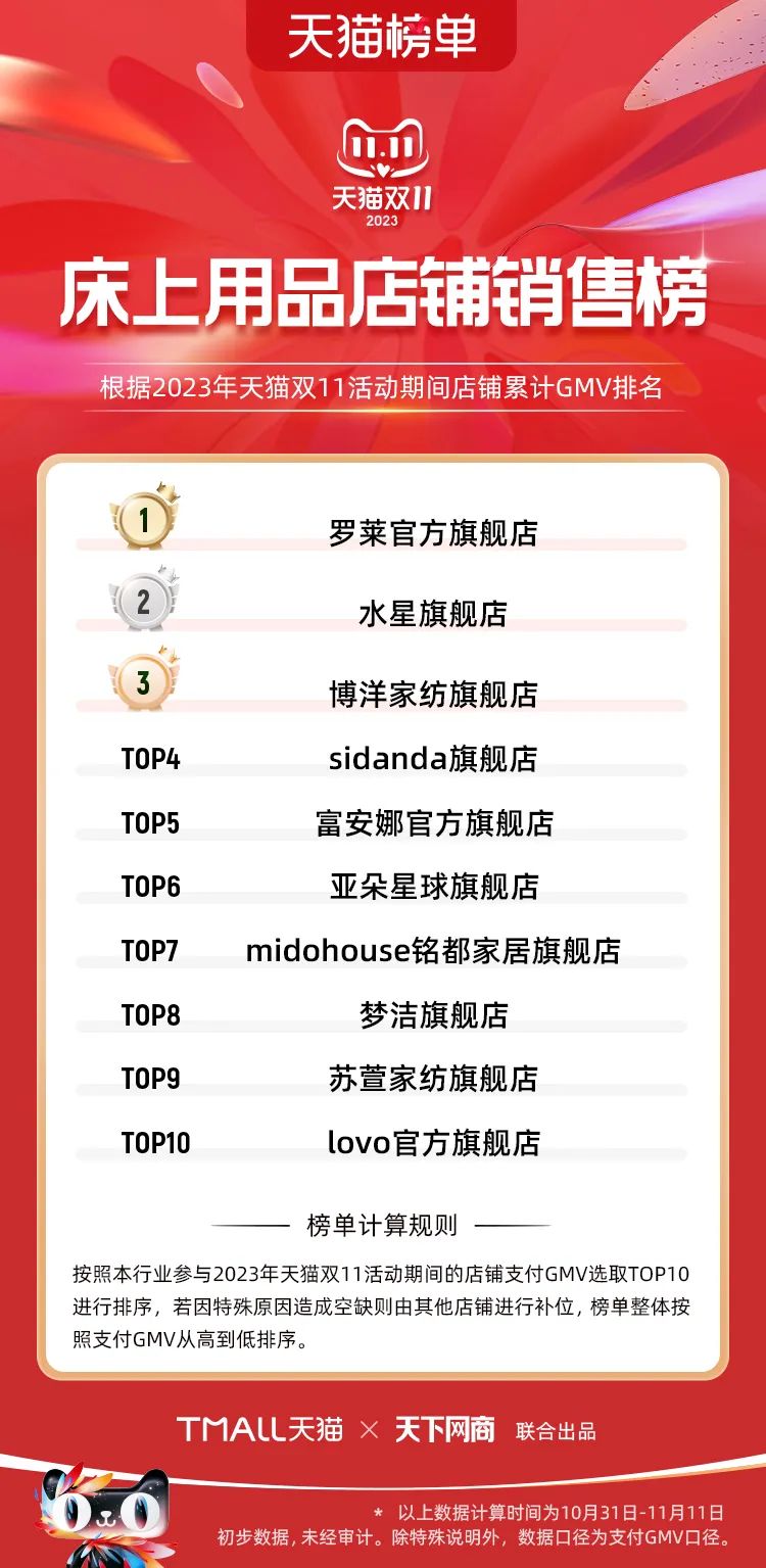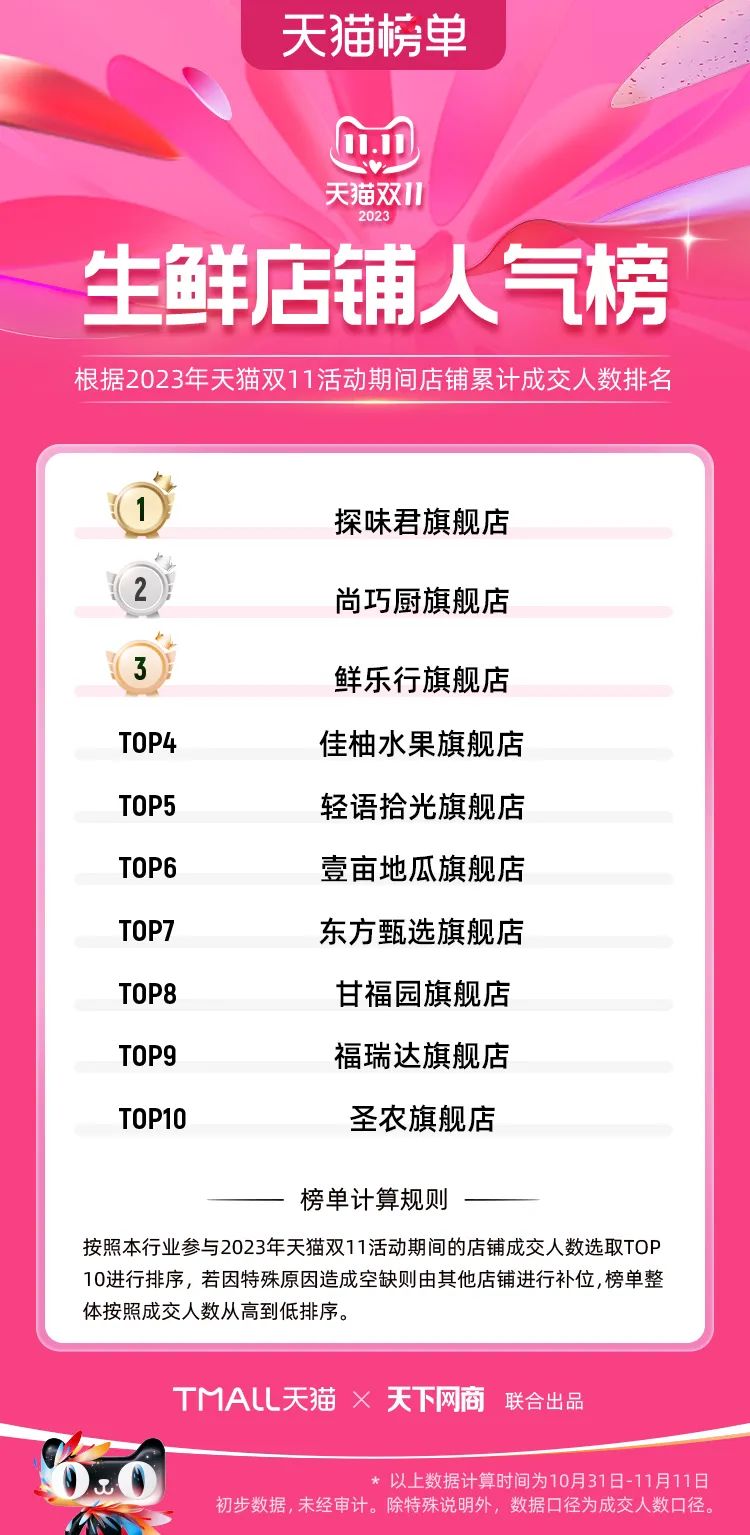 以下為2023年天貓雙11全周期(10月31日-11月11日)榜單: