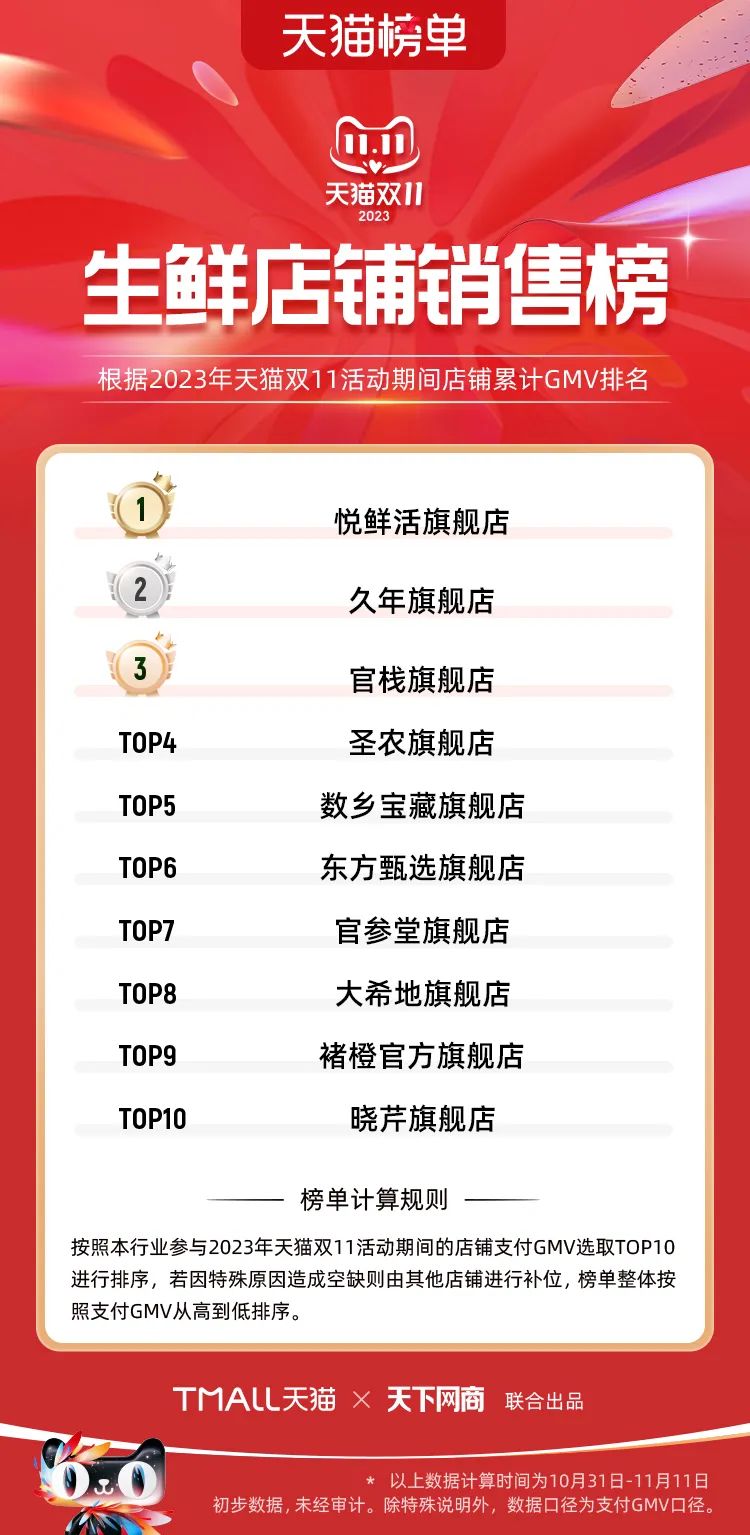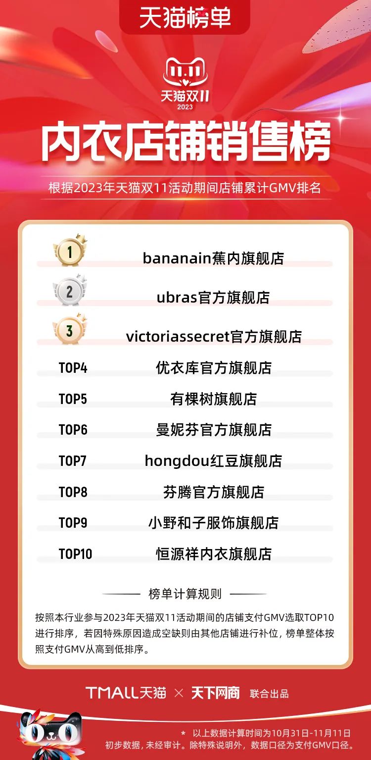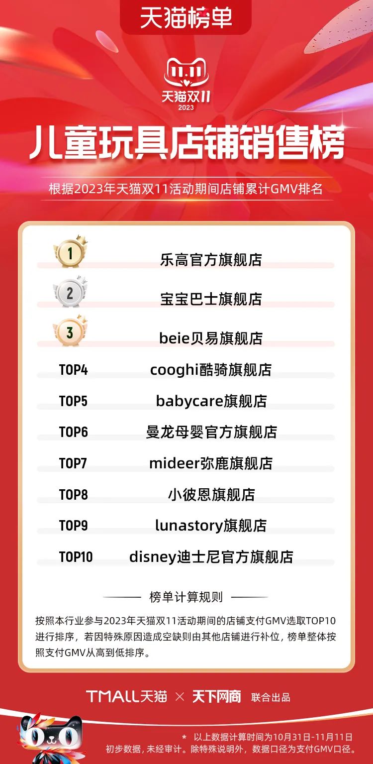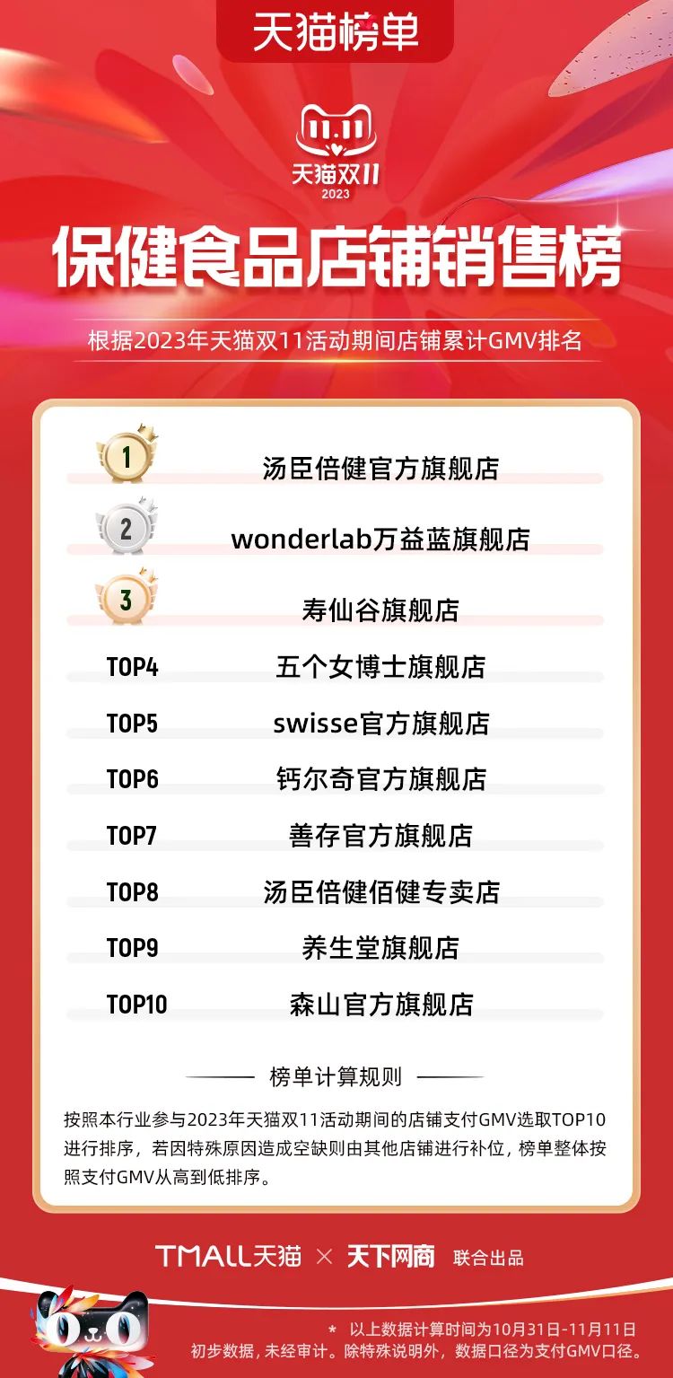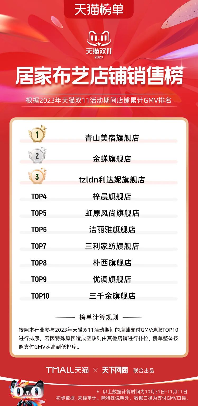 以下為2023年天貓雙11全周期(10月31日-11月11日)榜單: