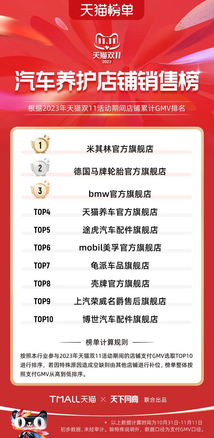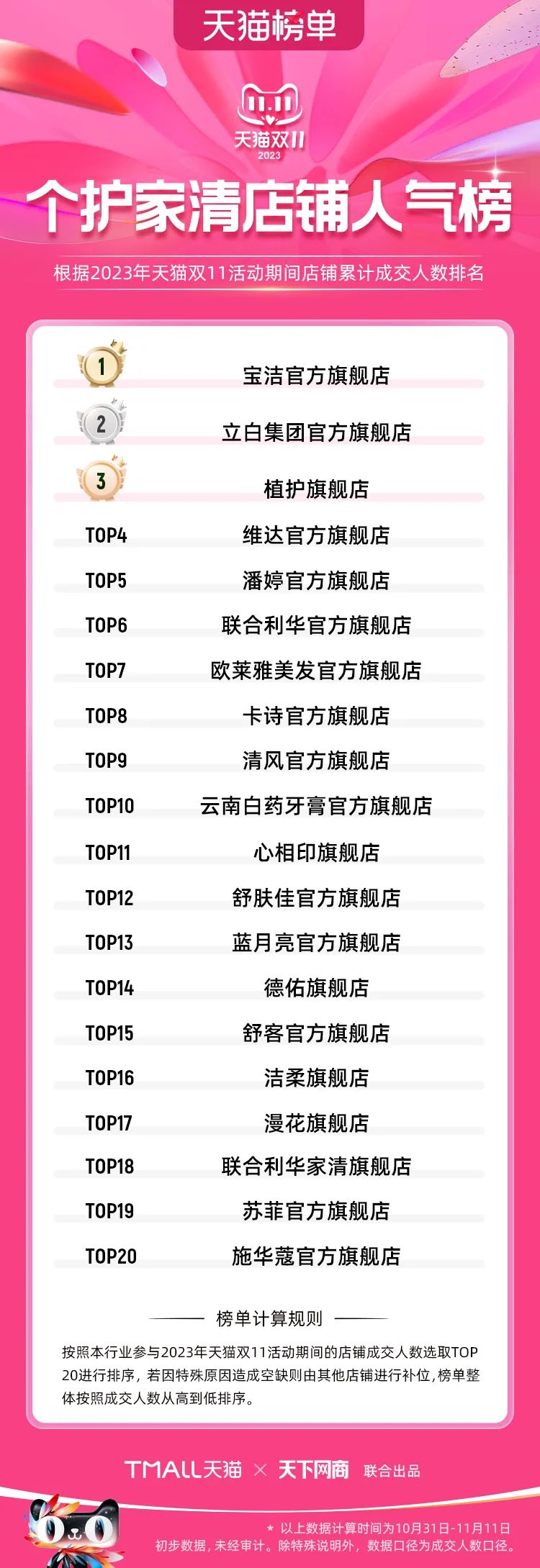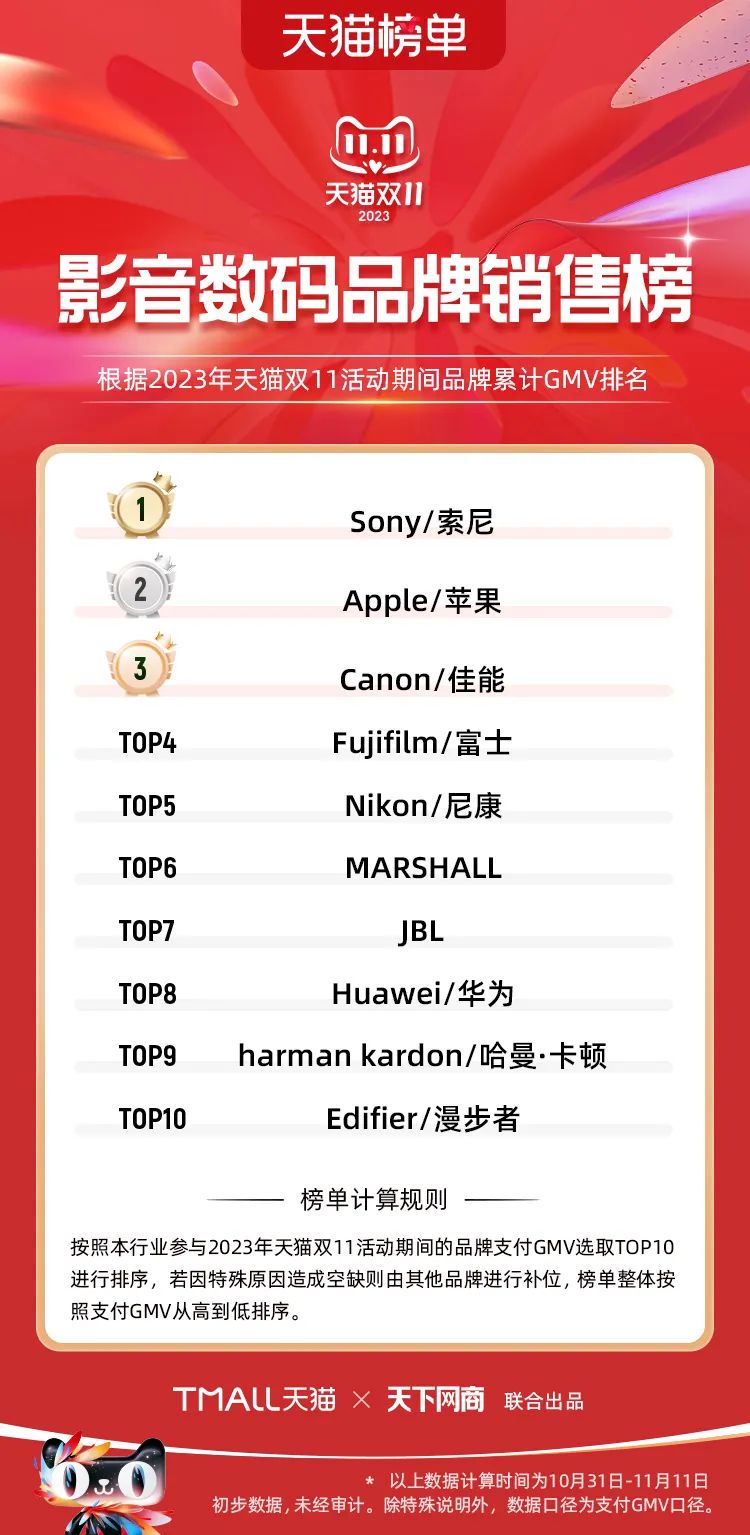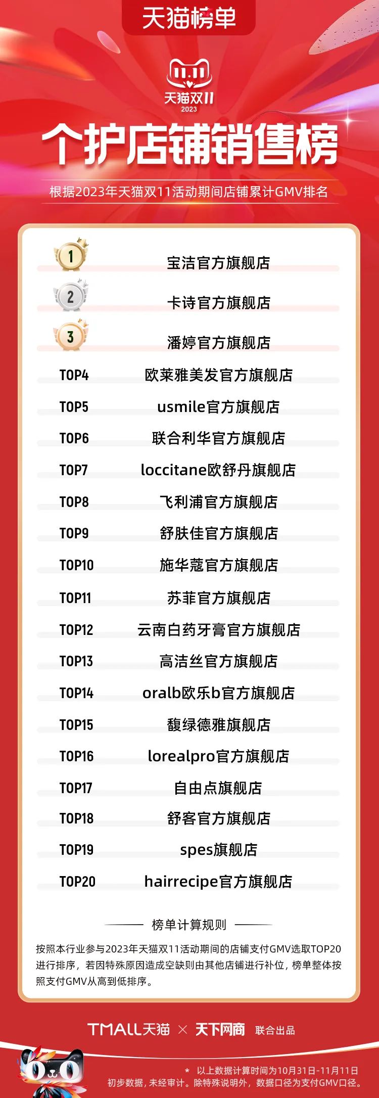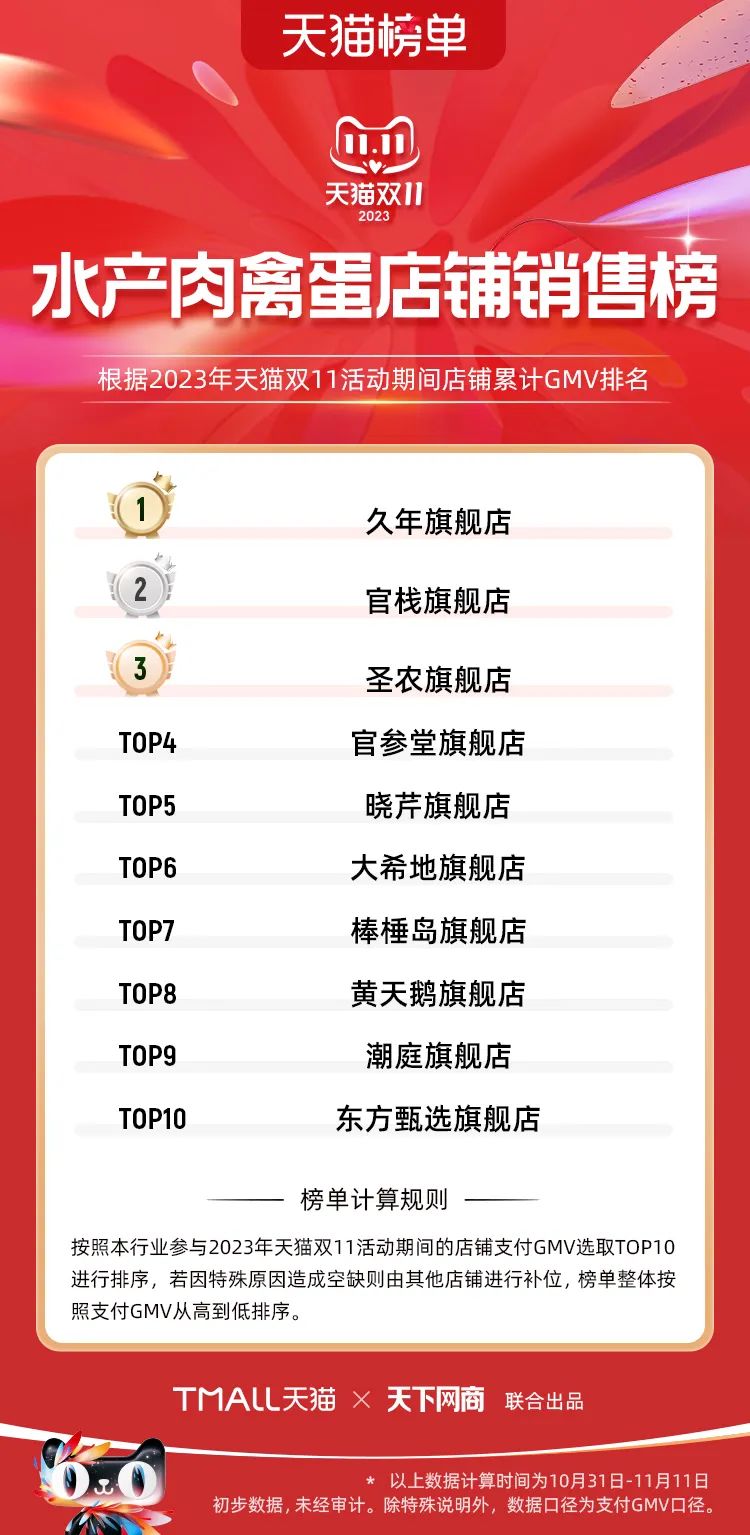 以下為2023年天貓雙11全周期(10月31日-11月11日)榜單: