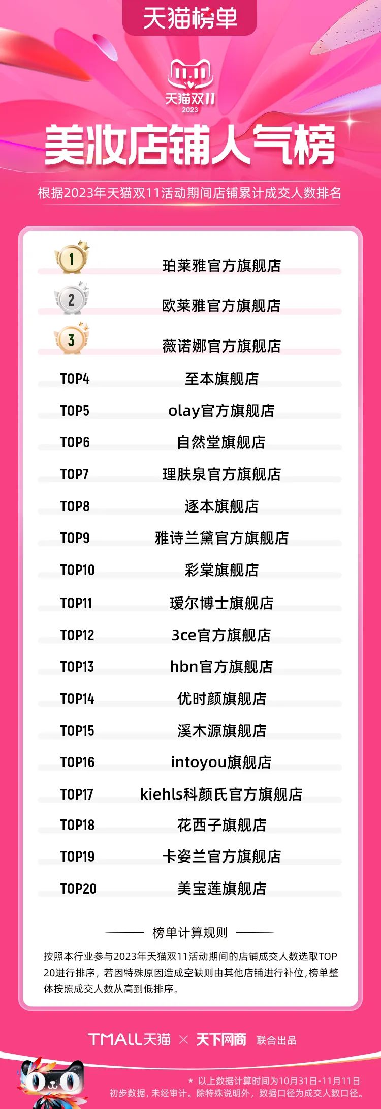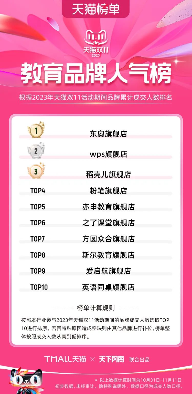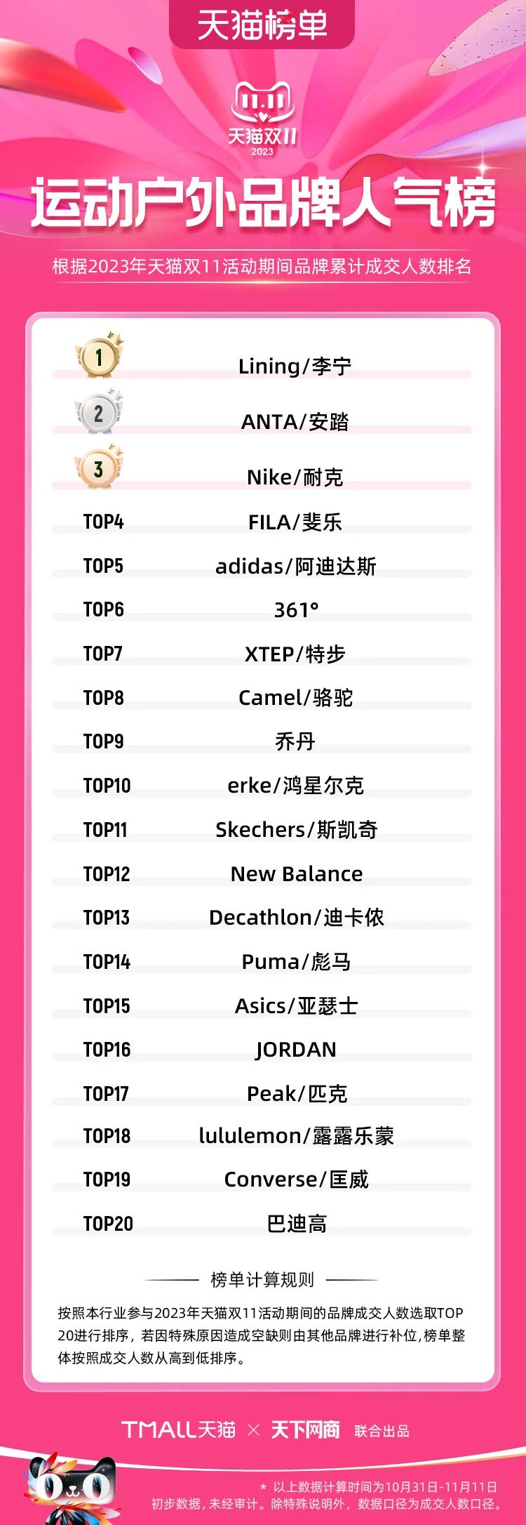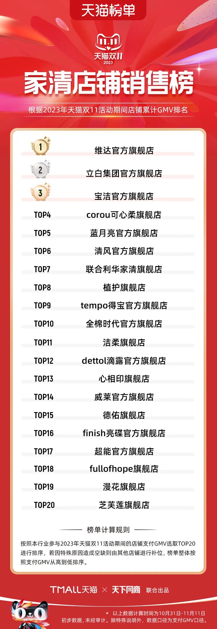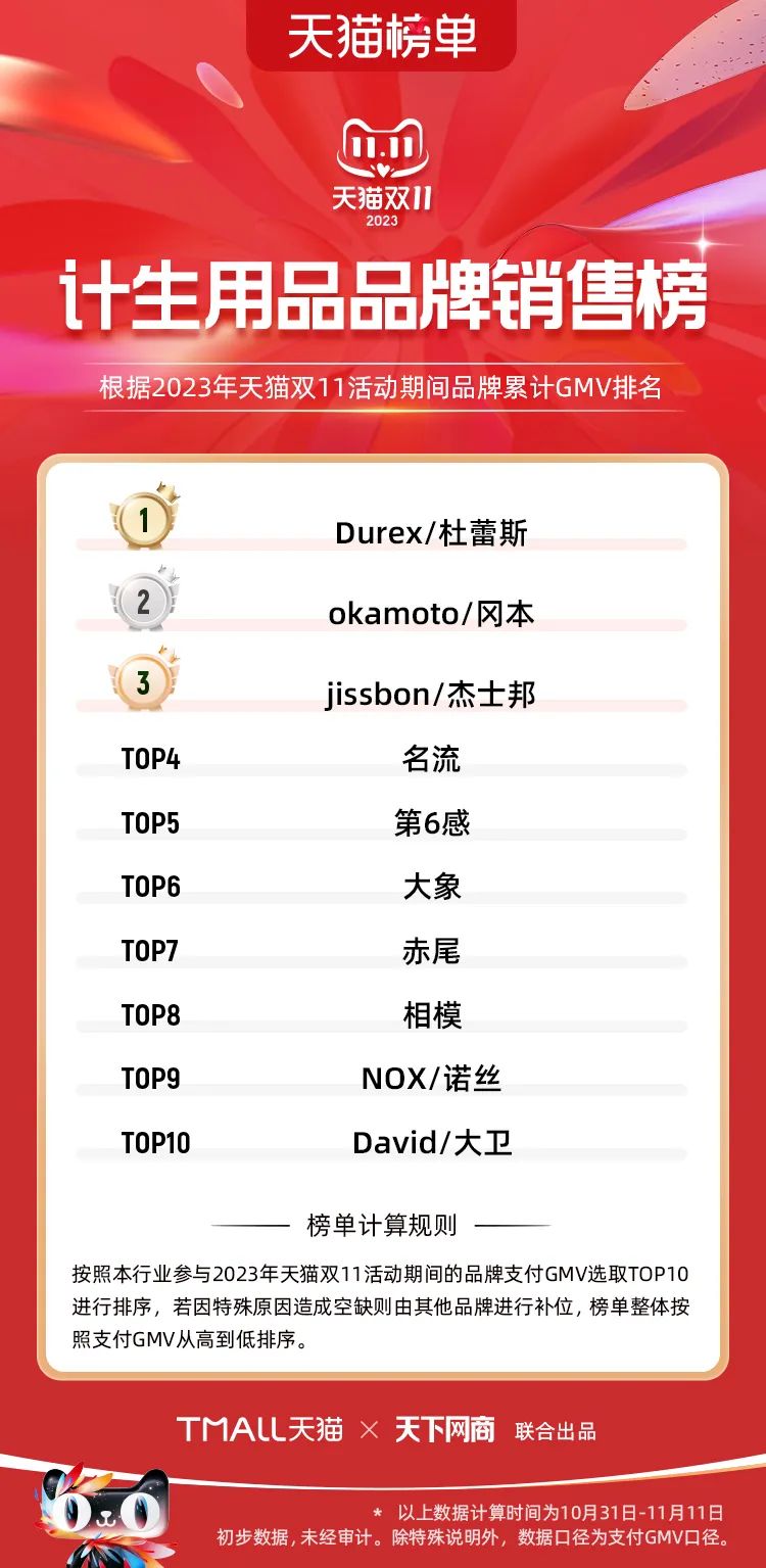 以下為2023年天貓雙11全周期(10月31日-11月11日)榜單: