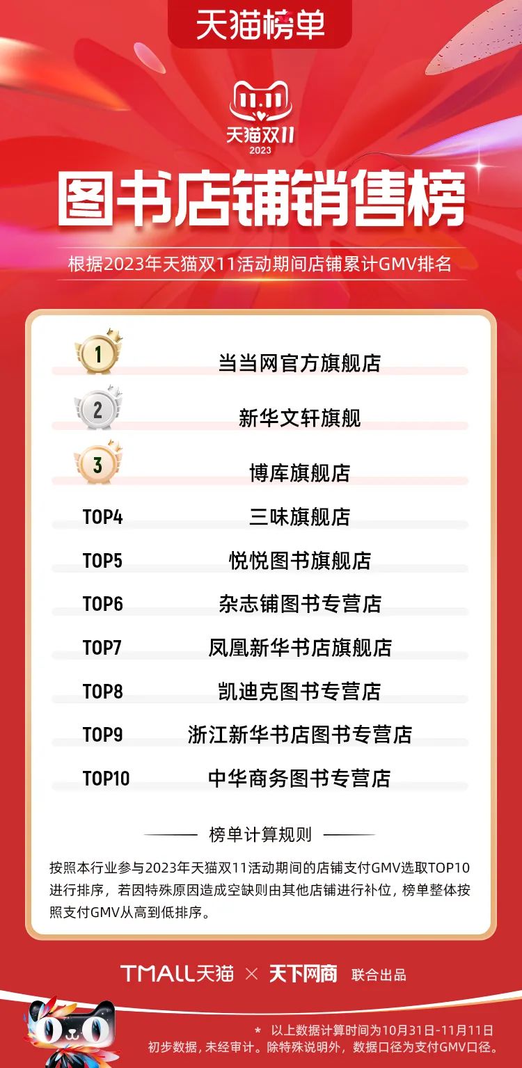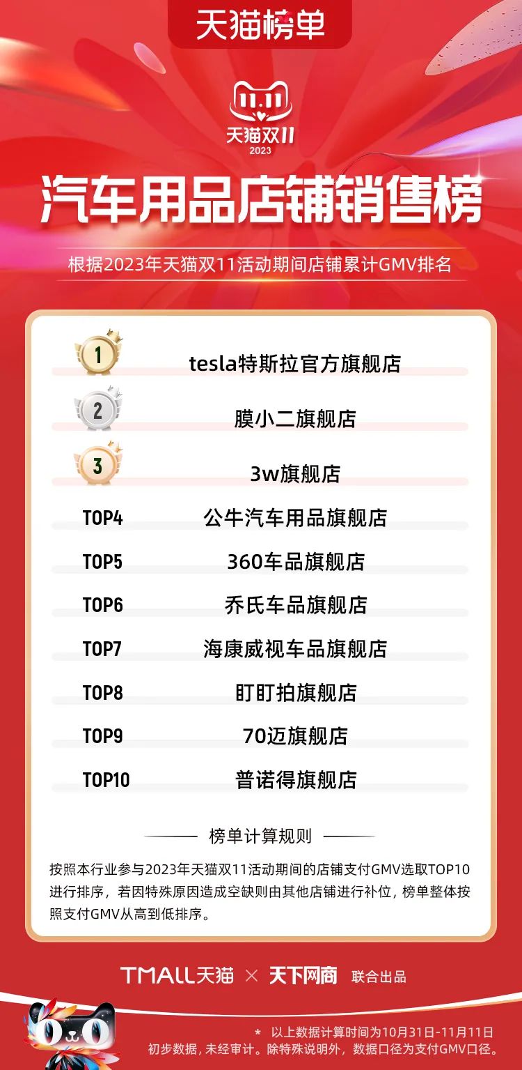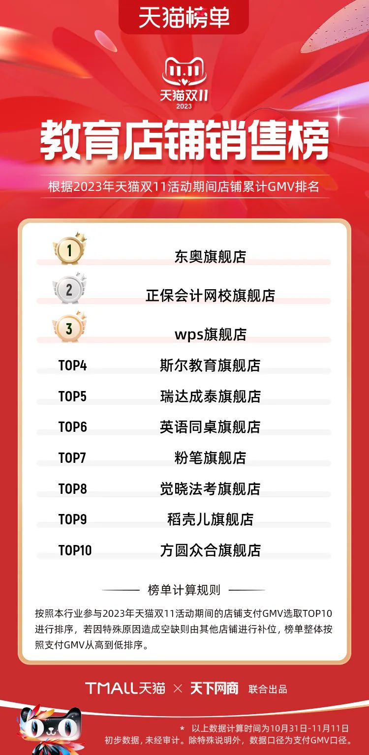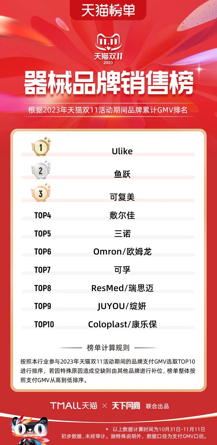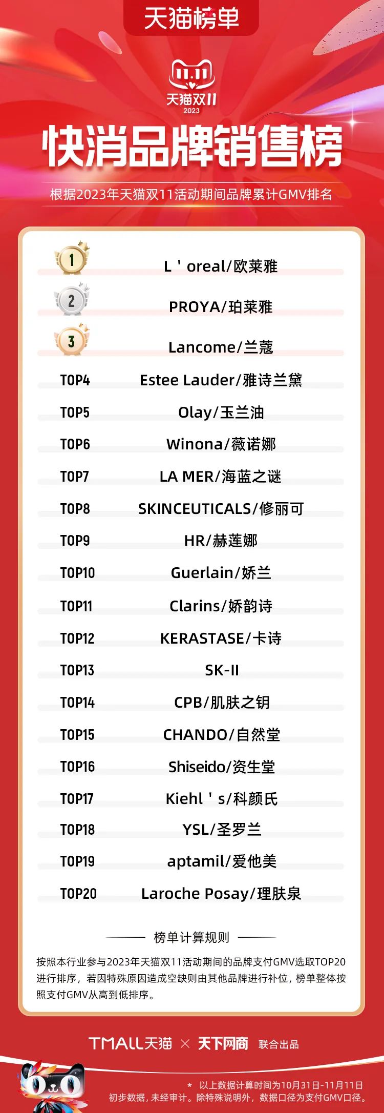 以下為2023年天貓雙11全周期(10月31日-11月11日)榜單: