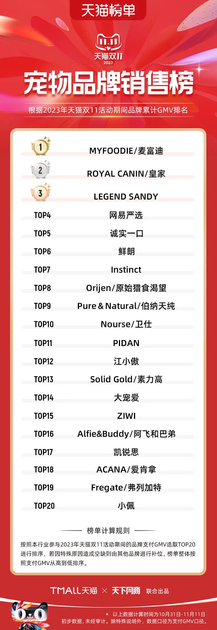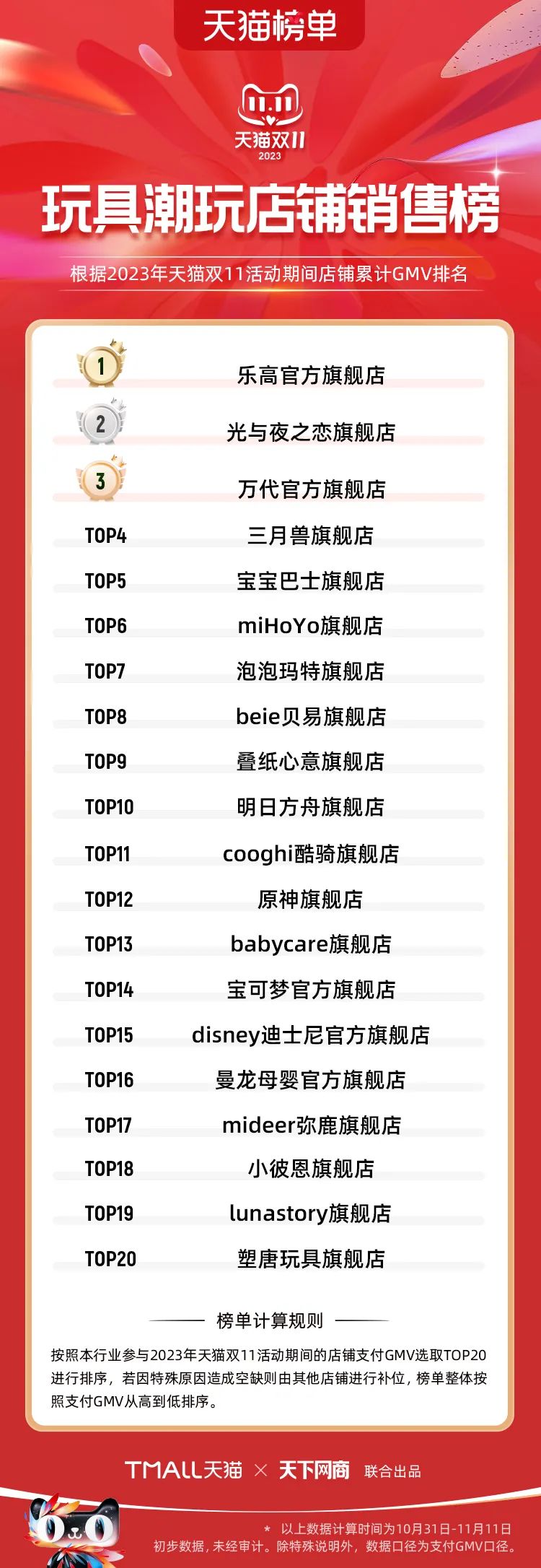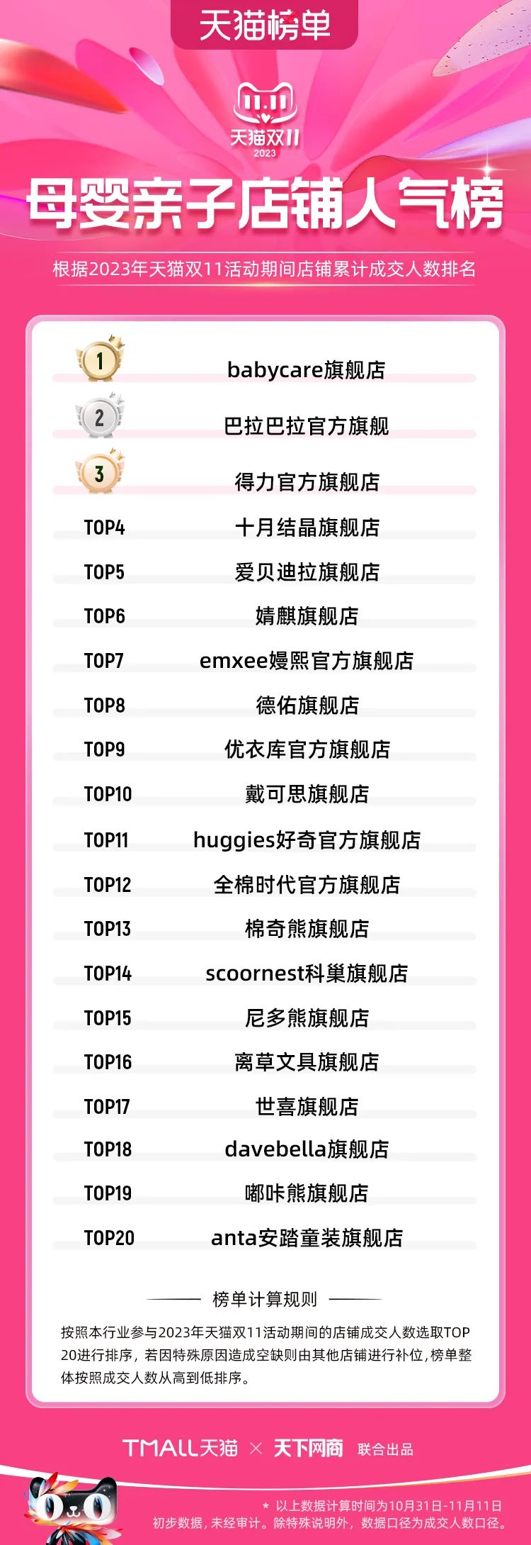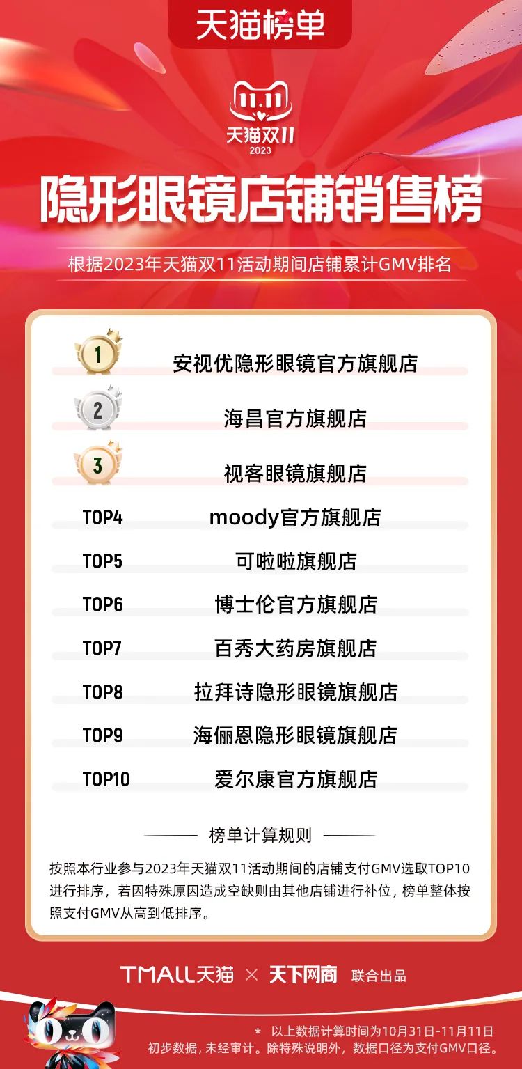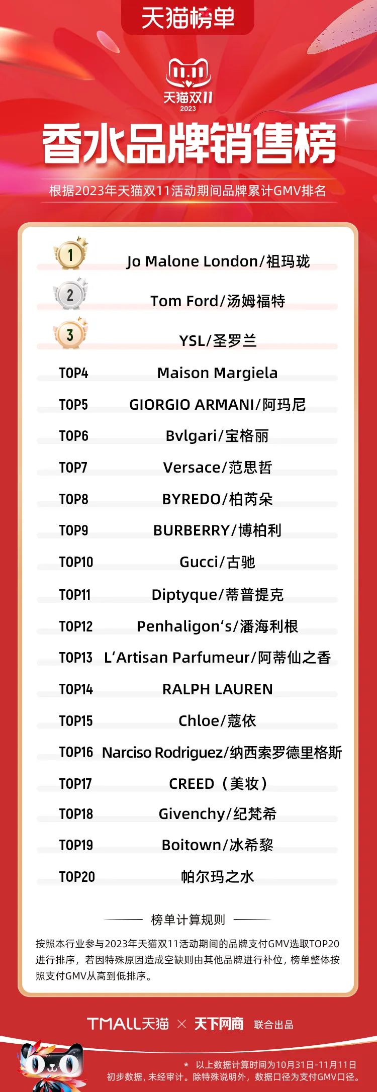 以下為2023年天貓雙11全周期(10月31日-11月11日)榜單: