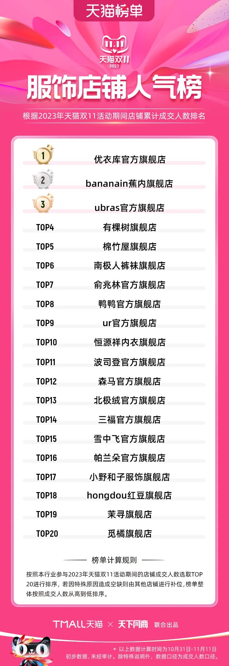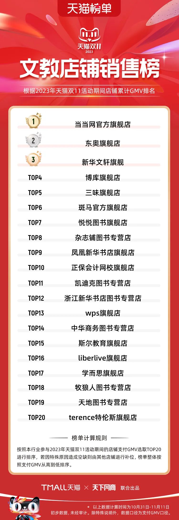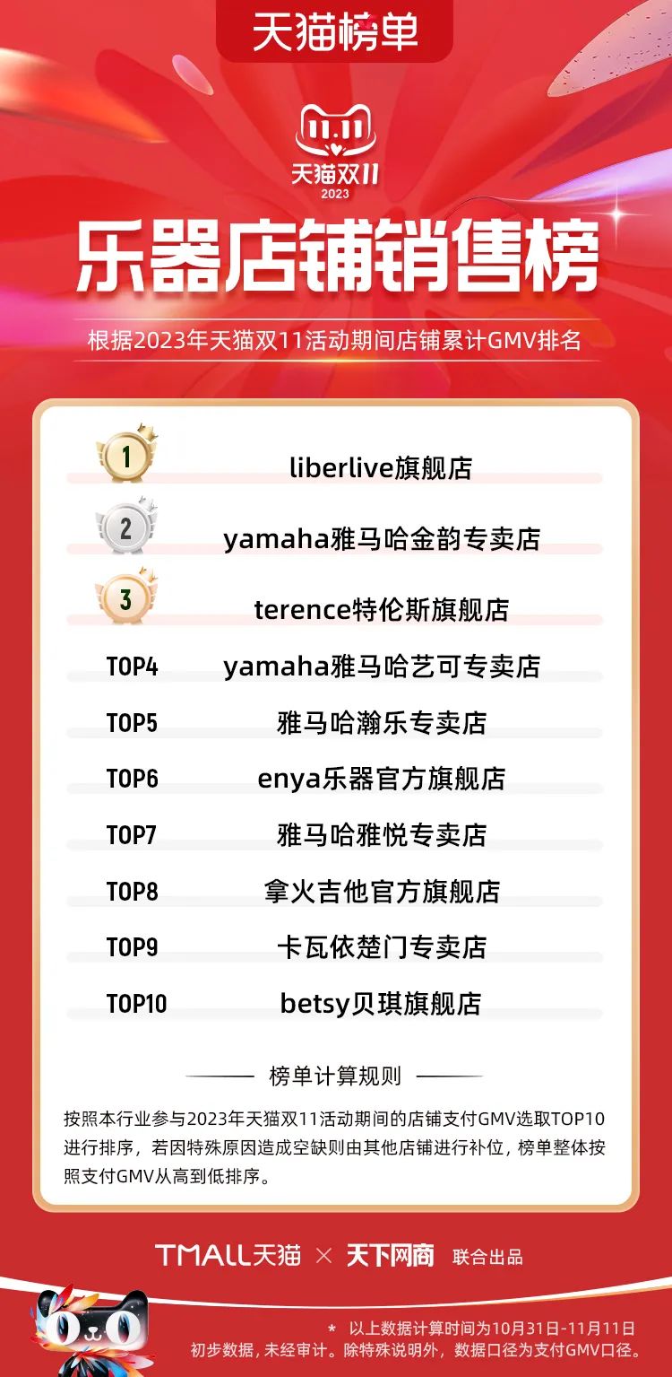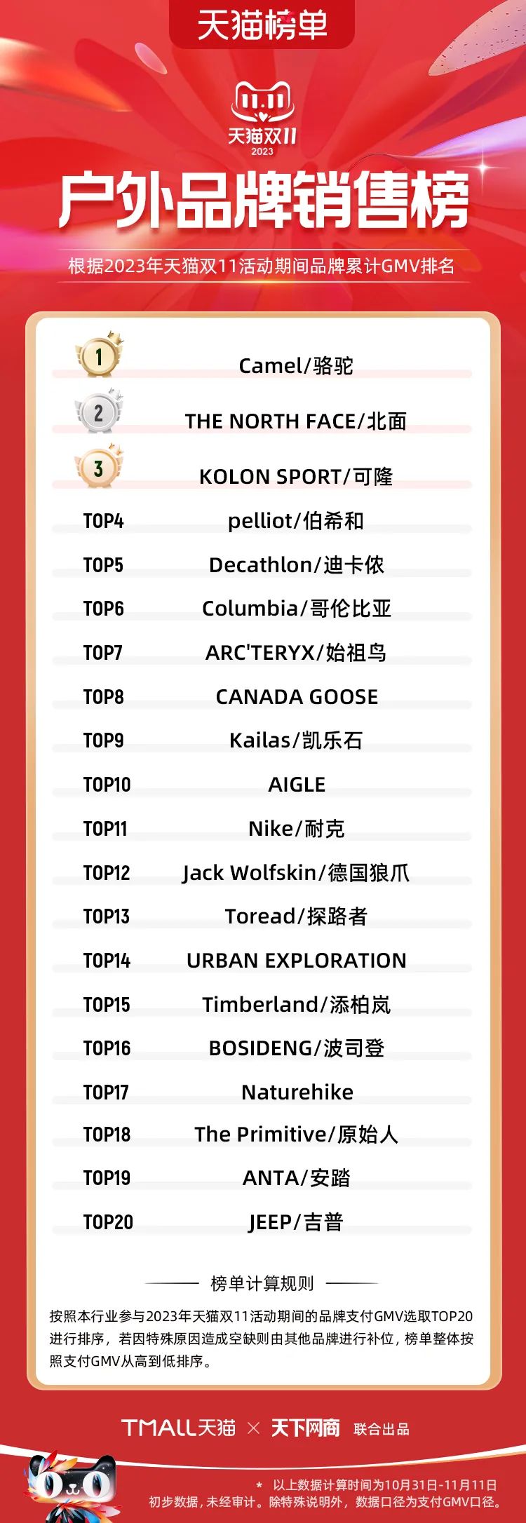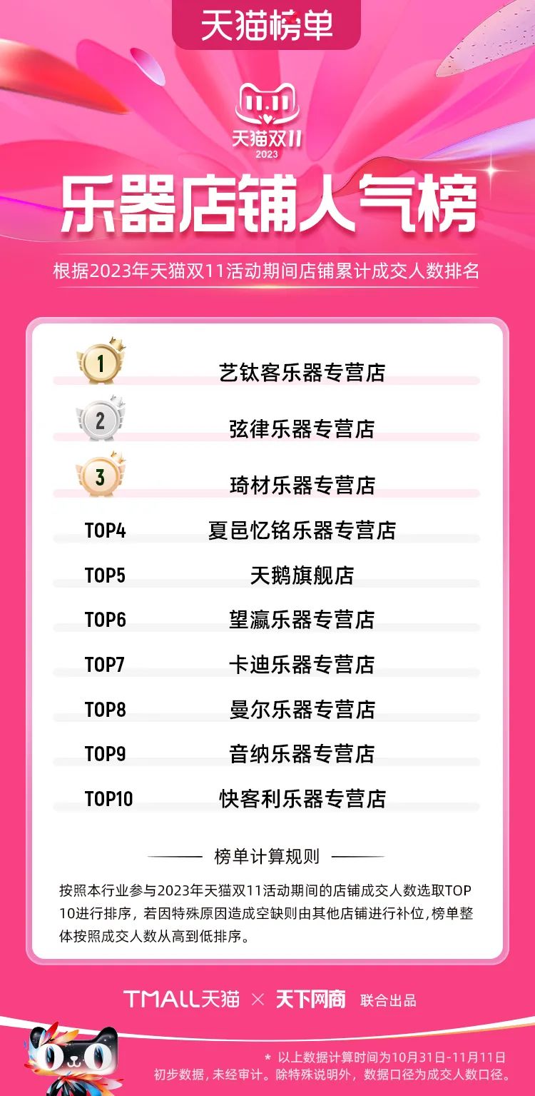以下為2023年天貓雙11全周期(10月31日-11月11日)榜單: