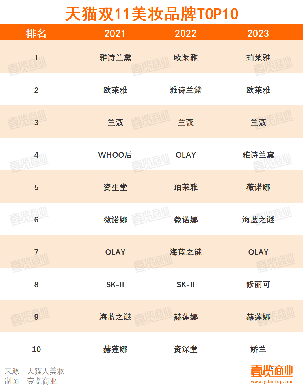 在美妝榜單,國貨首次登頂。壹覽商業(yè)統(tǒng)計(jì),前年雙11,美妝品牌top10含1個(gè)韓妝品牌(WHOO后)、兩個(gè)日妝品牌(資生堂、SK-II),一個(gè)國貨品牌(薇諾娜),去年,榜單上多了一家國貨(珀萊雅),韓妝品牌WHOO后掉出前十,今年,珀萊雅登頂,歐萊雅集團(tuán)兩大品牌淪為“左右護(hù)法”,日妝品牌全部掉出前十。其中,SK-II位列11,資生堂位列14.。