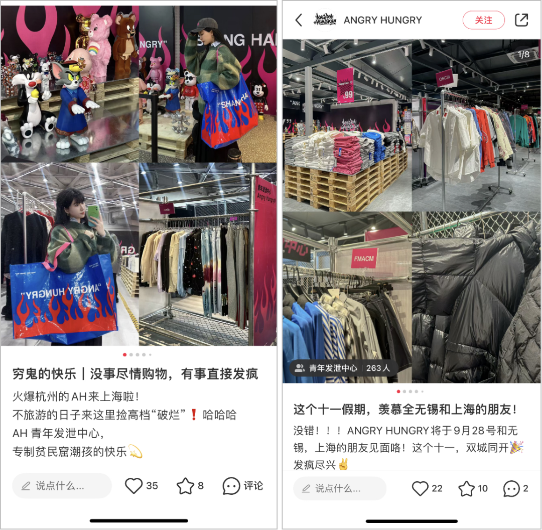 「Angry Hungry」以潮流大牌特賣快閃店的形式去到不同城市的奧特萊斯或潮人聚集地,被一些年輕消費(fèi)者稱為「貧民窟潮孩的購物天堂」。目前,「Angry Hungry」已經(jīng)在杭州下沙奧萊、無錫悅尚奧萊開設(shè)過快閃店,近期正在上海和蘇州進(jìn)行為期30天的快閃。