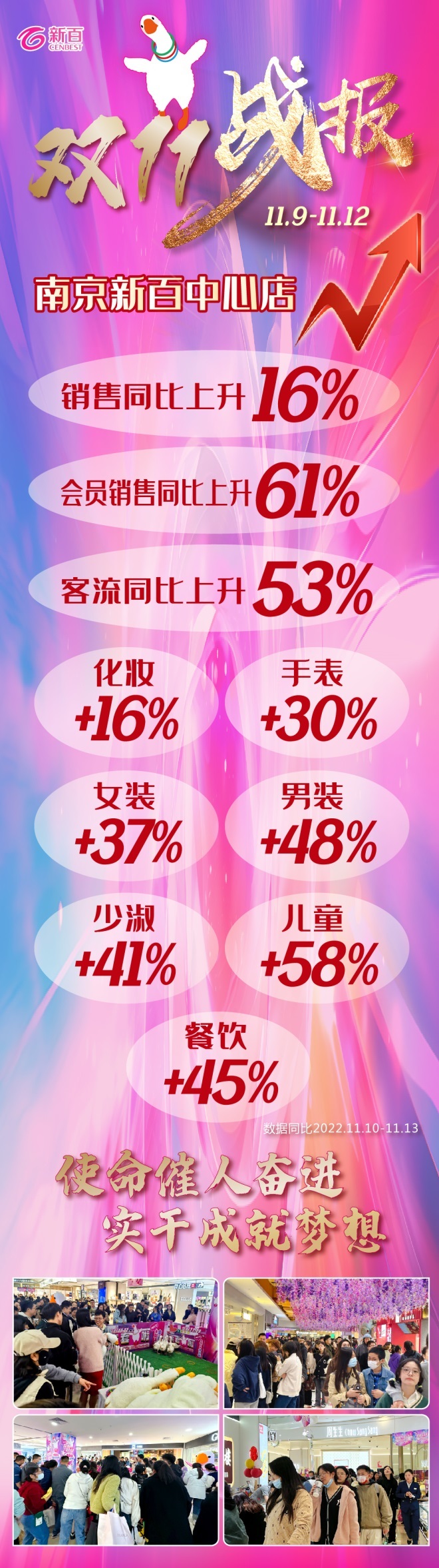 在此期間,南京新百中心店上下團(tuán)結(jié)一心,保持高昂的斗志,充滿激情地投入市場(chǎng)競(jìng)爭(zhēng)。檔期4天,南京新百中心店銷售同比上升16%,客流同比上升53%;重點(diǎn)品類銷售大幅增長(zhǎng),化妝+16%,手表+30%,女裝+37%,男裝+48%,少淑+41%,兒童+58%,餐飲+45%;會(huì)員銷售同比上升61%,11月以來(lái),銷售同比上升50%,成功實(shí)現(xiàn)總經(jīng)理胡雪飛關(guān)于“雙11”檔期的“兩個(gè)確!蹦繕(biāo),確保完成指標(biāo)的同時(shí),確保“好于對(duì)標(biāo),優(yōu)于同行”。