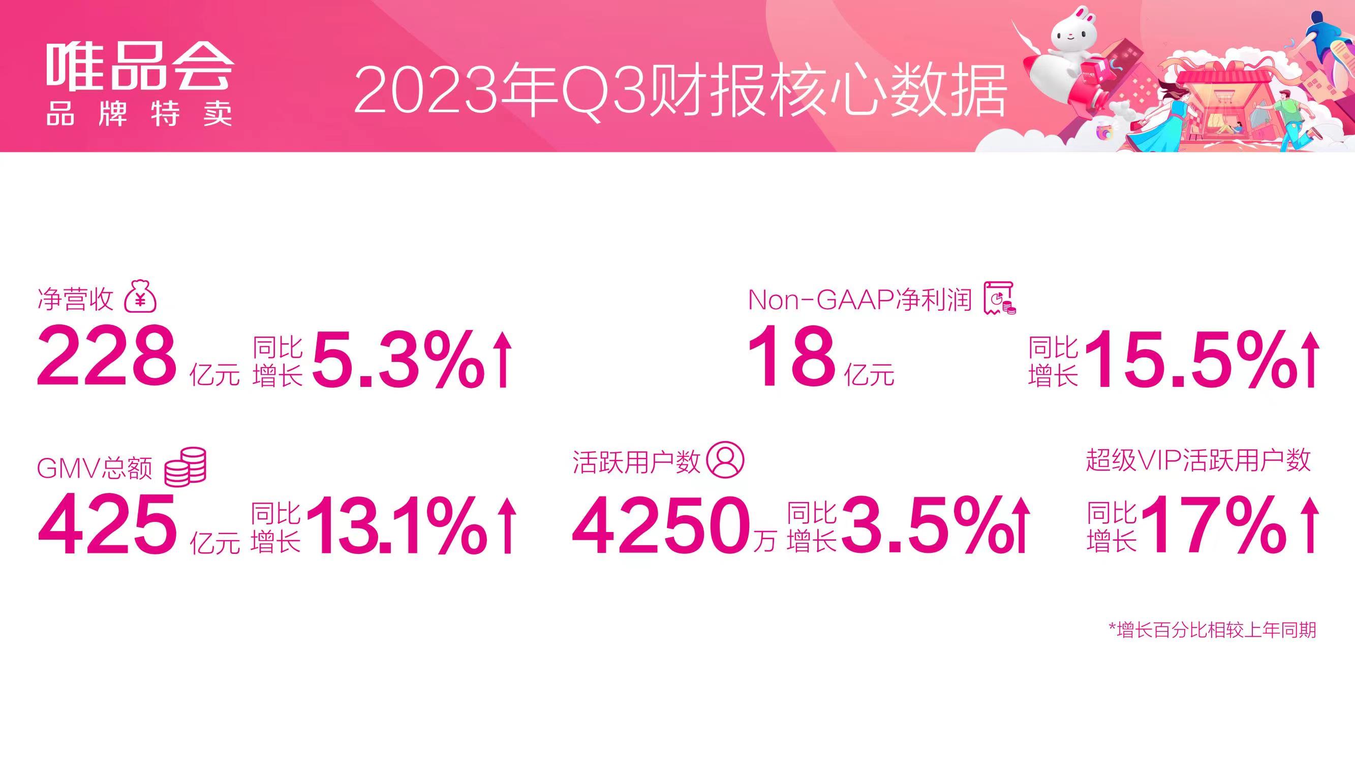 財(cái)報(bào)顯示,第三季度,唯品會(huì)實(shí)現(xiàn)凈營(yíng)收228億元,同比增長(zhǎng)5.3%;Non-GAAP凈利潤(rùn)18億元,同比增長(zhǎng)15.5%。同時(shí),三季度GMV為425億元,同比增長(zhǎng)13.1%;活躍用戶數(shù)4250萬(wàn),同比增長(zhǎng)3.5%;訂單數(shù)1.799億,同比增長(zhǎng)6.9%。