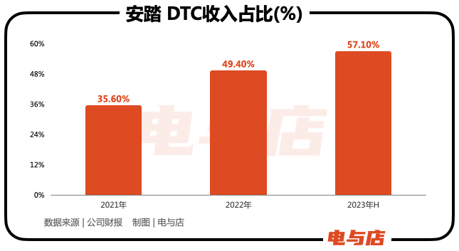 截至今年上半年,李寧總共有1423家直營店,僅占其門店總數(shù)的23%。相較2020年才開始DTC改革的安踏,目前直營店的數(shù)量占比已經(jīng)來到了近一半。安踏2023年中報顯示,公司截至2023年6月底的5500家門店中,有43%為品牌直營店,這些直營店為安踏貢獻了57.1%的收入。