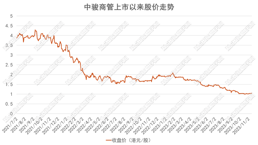 中駿商管于2021年7月上市,市值巔峰曾突破88億港元。截至11月15日,中駿商管當(dāng)前市值離最高峰已縮水75%以上,僅剩約19億港元,PE也僅約為9倍。