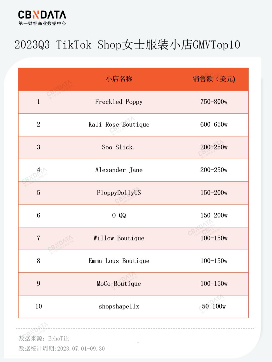 例如《TikTokShop美國第三季度發(fā)展趨勢報告》顯示,第三季度女士服裝熱銷小店TOP10中,多數(shù)上榜小店商品均價在30-50美元(約為220-360元人民幣)左右;從熱銷產(chǎn)品的類型來看,以基礎(chǔ)款服裝和牛仔服裝居多,如牛長褲、純色工字背心、純色連體上衣等。