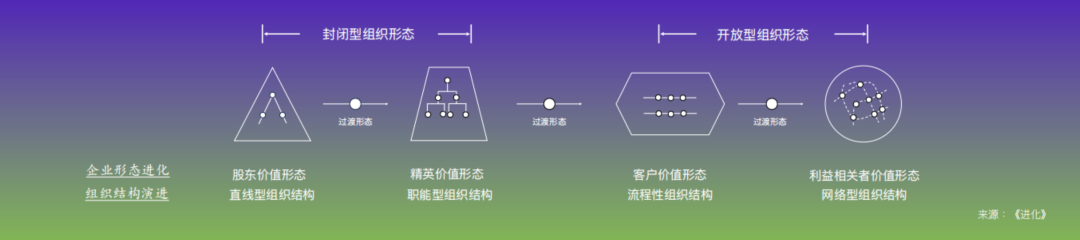 以上都是企業(yè)在組織匹配業(yè)務(wù)需求上的點(diǎn)狀、局部的優(yōu)化。跳出實(shí)踐,從組織結(jié)構(gòu)演變規(guī)律來看,我們的大部分企業(yè)目前還處于直線型、職能型組織結(jié)構(gòu)狀態(tài)。隨著企業(yè)形態(tài),由股東價值到精英價值,再到客戶價值形態(tài)的轉(zhuǎn)變,我們的組織也會逐漸升級到流程型組織結(jié)構(gòu)狀態(tài)。當(dāng)然,這些演進(jìn)都不會按順序、都不會清晰的由一個形態(tài)到下一個形態(tài),都是混合交織在一起的,不同企業(yè)更是各有不同。