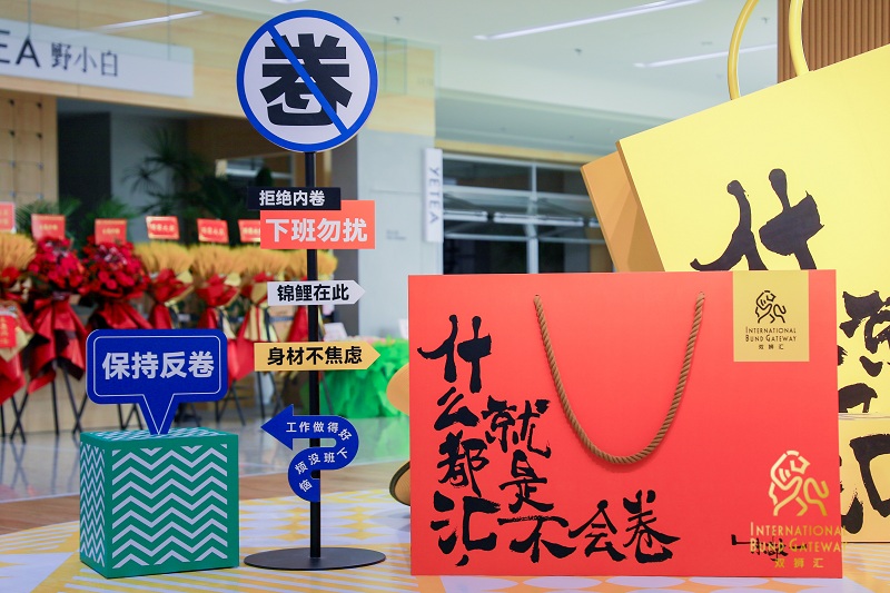 另外,開(kāi)業(yè)期間,商場(chǎng)與知名藝術(shù)家朱敬一先生聯(lián)手,在1樓中庭創(chuàng)作了“反卷藝術(shù)展”,力求以一種詼諧幽默的方式,為職場(chǎng)白領(lǐng)解壓;此外,還有沒(méi)毛病養(yǎng)生局、反EMO拳擊中心等趣味橫生的主題互動(dòng)區(qū),讓年輕群體重拾逛街樂(lè)趣。