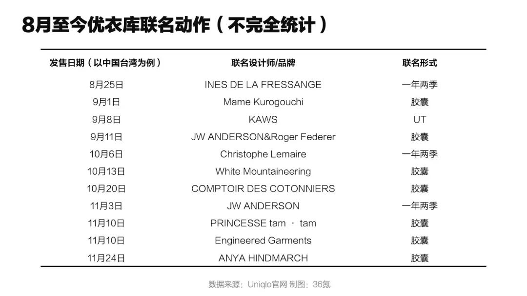 今年秋冬,優(yōu)衣庫聯(lián)名動作肉眼可見變得頻繁。據(jù)36氪不完全統(tǒng)計,8月以來,優(yōu)衣庫推出了11款聯(lián)名。除了每年都會有的JWA和INES系列,其余聯(lián)名對象均為第一次合作,或者多年以后的再續(xù)前緣,這令不少老粉歡呼雀躍。
