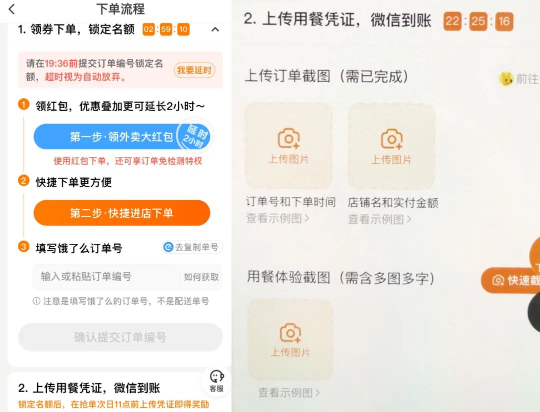 不同的平臺合作的商家、覆蓋的城市不同,但操作思路大致相同:先在霸王餐平臺搶返現(xiàn)名額——回到外賣平臺點(diǎn)單——收餐后拍照寫好評并截圖——將訂單編號和截圖上傳霸王餐平臺——等客服審核后拿到返現(xiàn)。