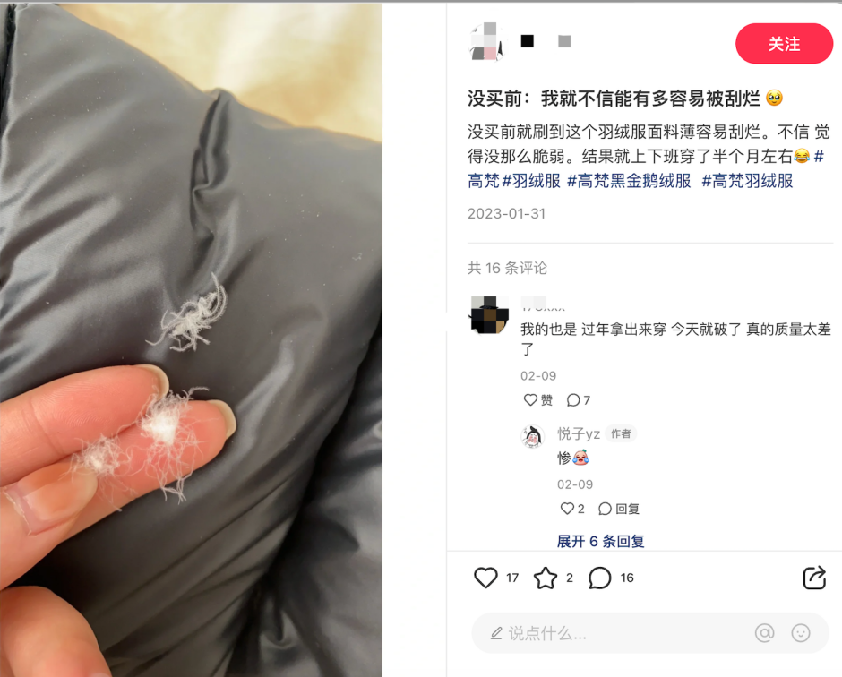 在小紅書(shū)上,除了鋪天蓋地的種草文外,也有部分爭(zhēng)議與之并存,其中不乏對(duì)高梵黑金羽絨服破損、易刮爛、跑絨嚴(yán)重、售后服務(wù)不滿(mǎn)等。