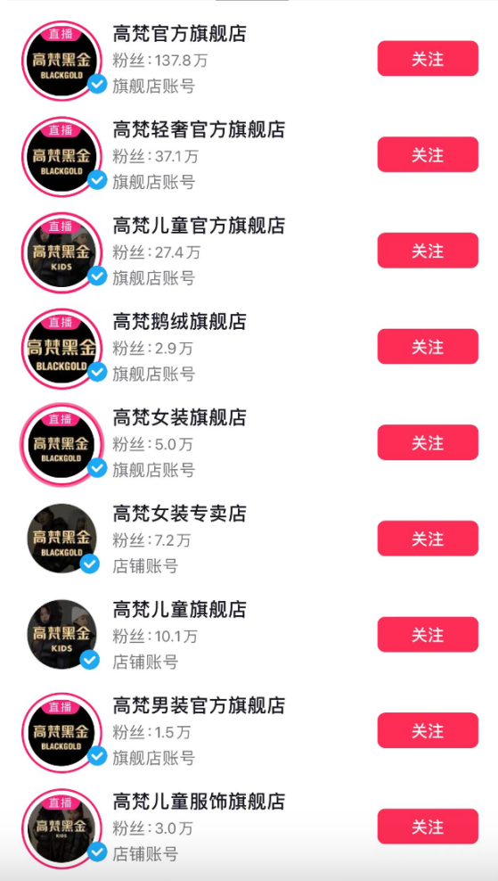 據(jù)不完全統(tǒng)計(jì),當(dāng)前高梵在抖音上的店播矩陣賬號(hào)達(dá)到了16個(gè),涵蓋了高梵官方旗艦店、高梵兒童官方旗艦店、高梵女裝旗艦店、高梵男裝官方旗艦店等,粉絲量最高單號(hào)達(dá)到了137.8萬(wàn)。
