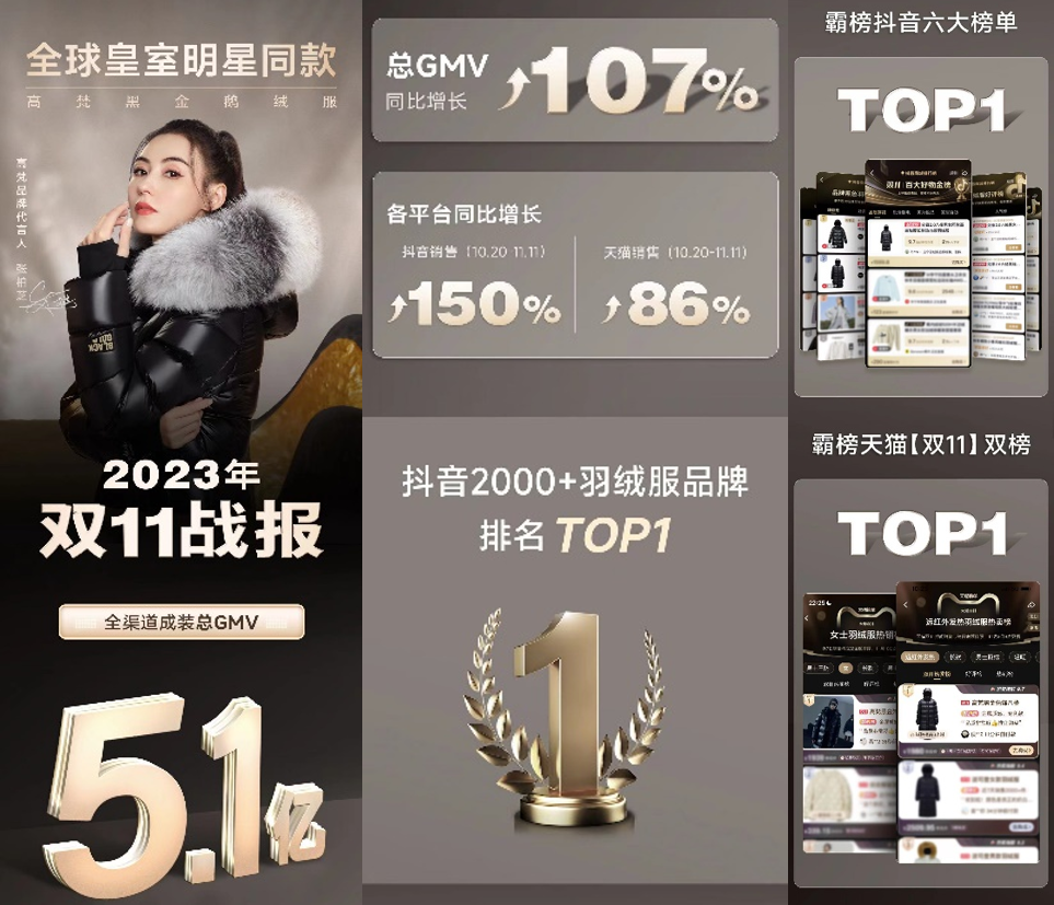 隨著氣溫驟降,在過(guò)去的雙十一購(gòu)物節(jié)中,鵝絨服品類(lèi)熱度持續(xù)攀升,專(zhuān)注于高端鵝絨服品類(lèi),號(hào)稱(chēng)全球皇室明星同款,請(qǐng)來(lái)張柏芝代言的高梵黑金鵝絨服在近日曬出了2023年雙十一戰(zhàn)報(bào),不僅霸榜抖音六大榜單,還成為了天貓雙11雙榜之首,此外其GMV整體增幅達(dá)到了107%。