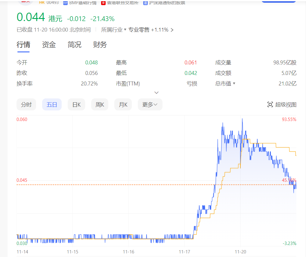 截至11月20日收盤,國(guó)美零售股價(jià)已跌至0.044港元每股。