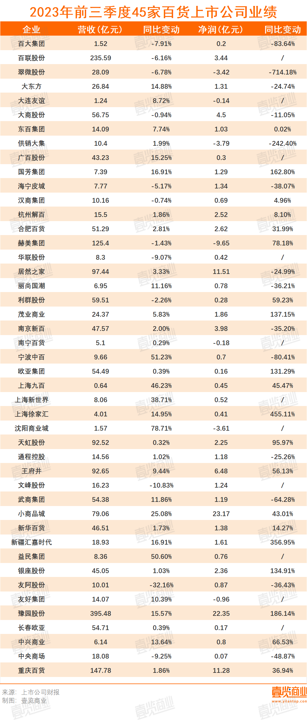 三季度百貨依舊渡劫,45家上市公司凈利潤僅0.6億