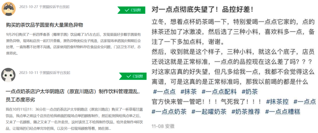 筆者以“1點點”為關(guān)鍵詞在黑貓投訴平臺進行搜索,發(fā)現(xiàn)其累積投訴量為439件,主要問題集中在喝出異物(如蟲子、釘子、塑料、頭發(fā)等)、服務(wù)不佳(有的店員服務(wù)態(tài)度冷漠甚至出現(xiàn)過辱罵)等情況。