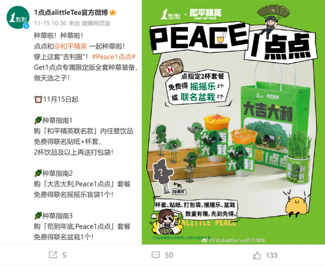 雖然1點點曾進行過少量的營銷活動,卻整體話題度較低。就拿近期1點點與和平精英聯(lián)名的營銷活動來說,官博下方點贊量、評論量始終不盡如人意。