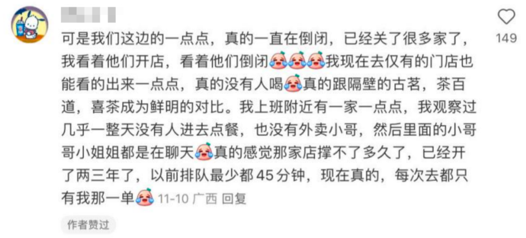 小紅書、微博等社交媒體平臺上,有加盟商反映現(xiàn)在利潤不到10%,只能在殘酷的現(xiàn)實面前選擇閉店。1點點和加盟商相輔相成,加盟商的離場對于1點點來說無疑是致命的打擊。
