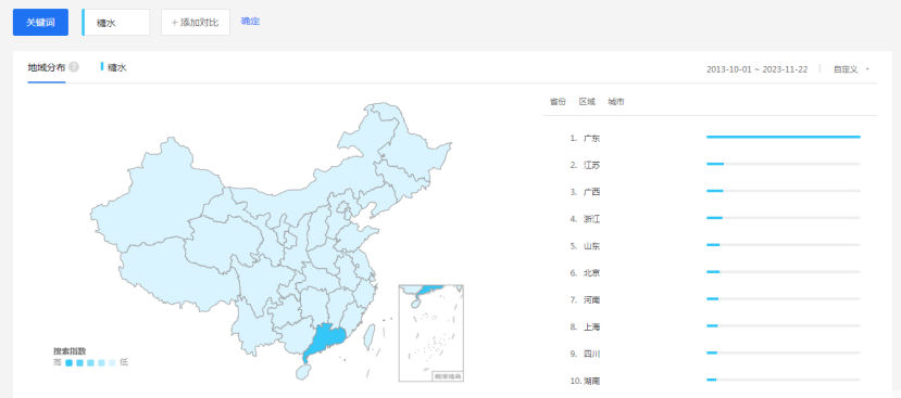 糖水,在兩廣地區(qū)較為流行。在全國很多城市,尤其是北方,幾乎沒有吃糖水的習(xí)慣。百度指數(shù)顯示,糖水的人群畫像以廣東地區(qū)為主,并且遙遙領(lǐng)先于其它省份。