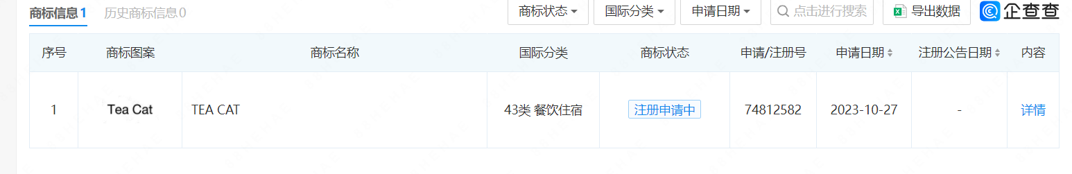 企查查顯示,庫迪供應(yīng)鏈(安徽)有限公司在10月27日便申請了茶貓英文商標(biāo)Tea cat茶貓。