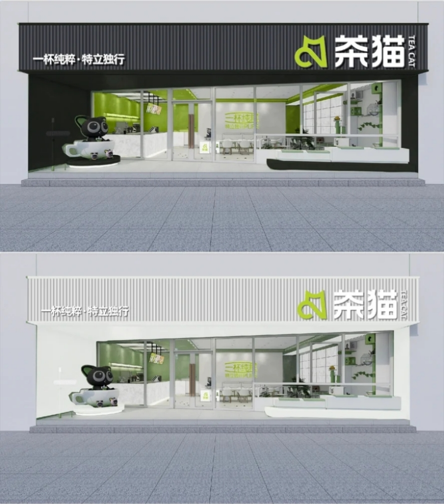 Tea cat茶貓品牌設(shè)計采用綠色及白色色彩搭配的品牌設(shè)計,在視頻中茶貓共有三種類型的門店,庫迪并未對店鋪類型做出明確命名。不過從圖片觀察來看茶貓的三種店型與庫迪咖啡現(xiàn)有的品牌店、店中店、快取店的大小基本一致。