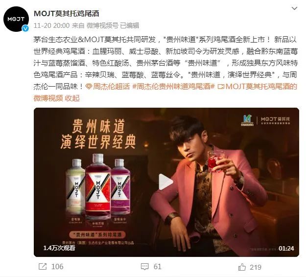 三年后的今天,這份微醺得到更大范圍的“擴(kuò)散”。11月20日,茅臺(tái)生態(tài)農(nóng)業(yè)公司與國內(nèi)專注做雞尾酒的品牌莫其托(MOJT)宣布推出共同研發(fā)的“貴州味道”系列雞尾酒,包括辛辣貝瑞、藍(lán)莓酸、藍(lán)莓絲令三款,還官宣由周杰倫擔(dān)任產(chǎn)品代言人及首席品鑒官。