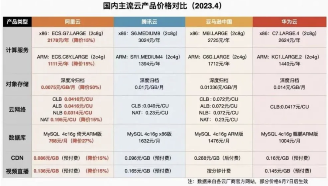 為了擴大收入規(guī)模,今年4月,阿里云祭出史上最大規(guī)!皟r格戰(zhàn)”:其核心產(chǎn)品價格全線下調15%至50%,同時推出“飛天免費試用計劃”,向開發(fā)者提供80余款云產(chǎn)品的免費試用,時長最多可達三個月。以數(shù)據(jù)庫和對象儲存產(chǎn)品為例,降價后,阿里云深度冷歸檔產(chǎn)品的價格為0.0075元/GB/月,而騰訊云、華為云相等產(chǎn)品分別為0.01元和0.014元。
