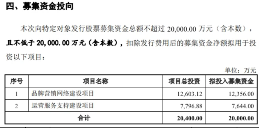 2023年11月14日,萬辰集團(tuán)披露向特定對(duì)象發(fā)行股票募集說明書,擬募資2億元,其中1.24億元用于品牌營(yíng)銷網(wǎng)絡(luò)建設(shè)項(xiàng)目。據(jù)悉,“品牌營(yíng)銷網(wǎng)絡(luò)建設(shè)項(xiàng)目將新增100 家直營(yíng)門店,大幅提高公司擁有的直營(yíng)門店數(shù)量”。