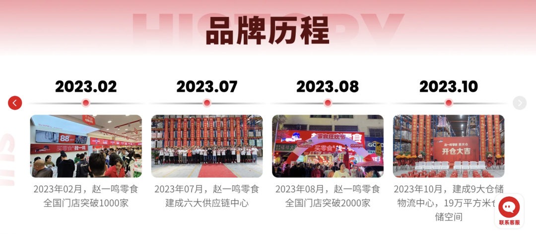 同樣來自其官網(wǎng)資料,截至2022年10月,趙一鳴零食的門店數(shù)量?jī)H500家,到了2023年8月,趙一鳴零食的門店數(shù)便突破2000家。不到一年時(shí)間,趙一鳴零食門店數(shù)增長(zhǎng)超1500家,成為中國(guó)量販零食賽道的又一位重量級(jí)玩家。