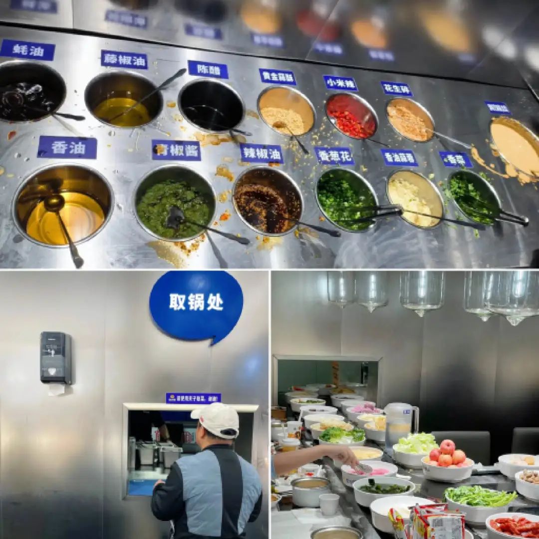 進(jìn)店后,顧客拿著訂單票去窗口拿鍋底,小料臺(tái)有麻醬、油料相對比較全面,值得注意的是,店內(nèi)會(huì)持續(xù)強(qiáng)調(diào)顧客只能堂食不能外帶,這也是避免有人因不自覺而把水果小吃等帶走,造成門店食材浪費(fèi)和成本增加。