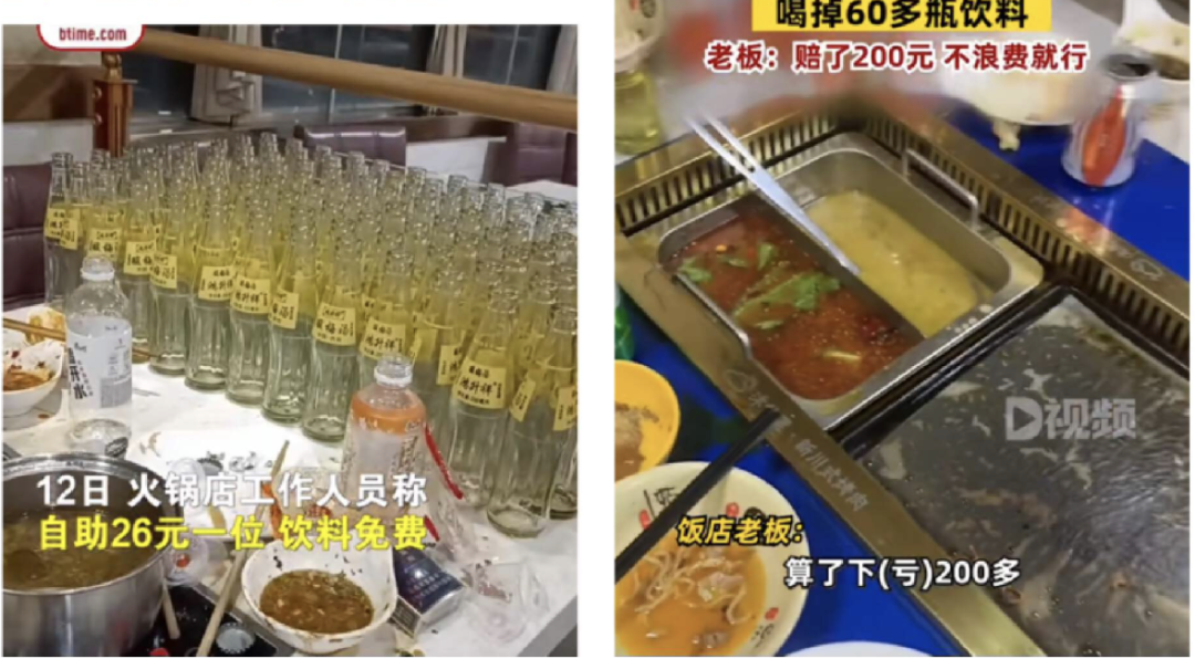 無獨(dú)有偶,10月20日在山西呂梁,3個(gè)小伙在某自助火鍋店喝了60多瓶飲料。老板表示,店里每人收費(fèi)30元,鍋底一共10元,提供的飲料都是品牌的,不是臨期的,算了一下自己大概虧了200塊。