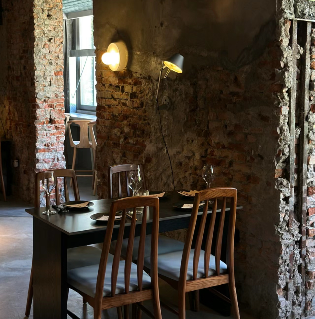 毛坯墻面、金屬桌椅、配上精致的高腳杯,工業(yè)和高大上的碰撞,燈光一渲染。