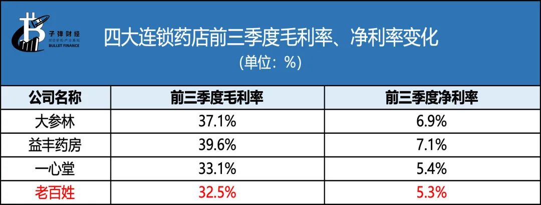 值得一提的是,前三季度,門店數(shù)量最多的老百姓,毛利率、凈利率均低于同行。老百姓的毛利率為32.5%,凈利率為5.32%。大參林、益豐藥房、一心堂毛利率分別為37.05%、39.55%、33.13%,凈利率分別為6.9%、7.1%、5.4%,均高于老百姓。